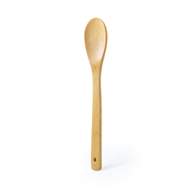 Cucchiaio da cucina in legno di bambù. Presentato in busta individuale con rinforzo in cartone fustellato.