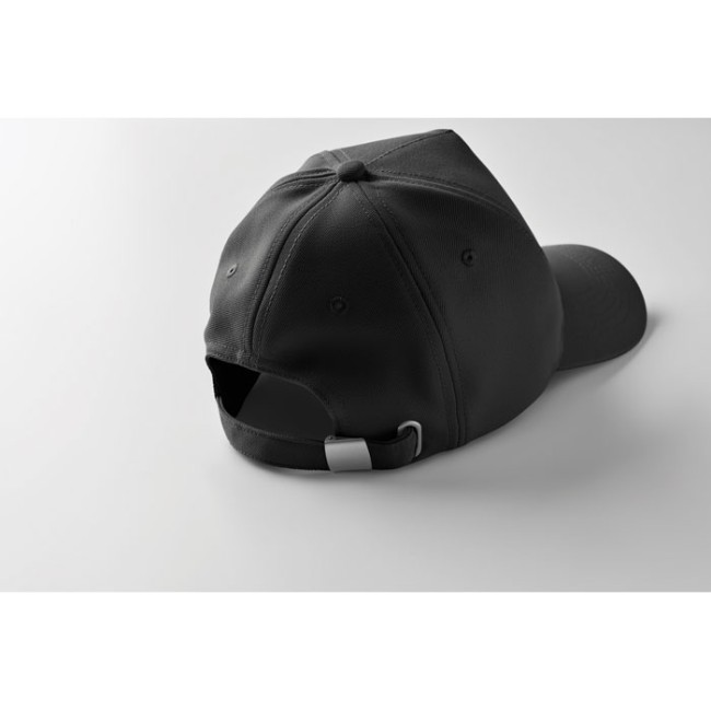 Cappellino da baseball a 5 pannelli in poliestere Rpet 210 gr/m² con fibbia in acciaio argentato. 4 occhielli ricamati in tinta. Taglia 7 1/4.