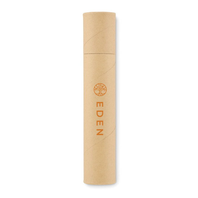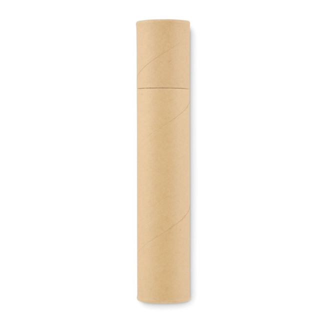 Set di articoli di cancelleria presentato in una scatola a tubo di carta. Include 2 matite, 1 penna in cartone, 1 temperino in legno e 1 gomma, ideale per tenere tutto in ordine e facilmente accessibile.
