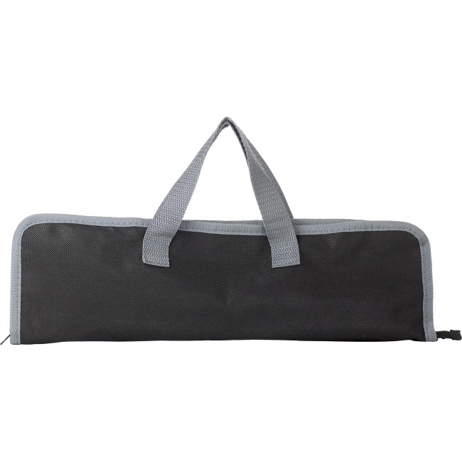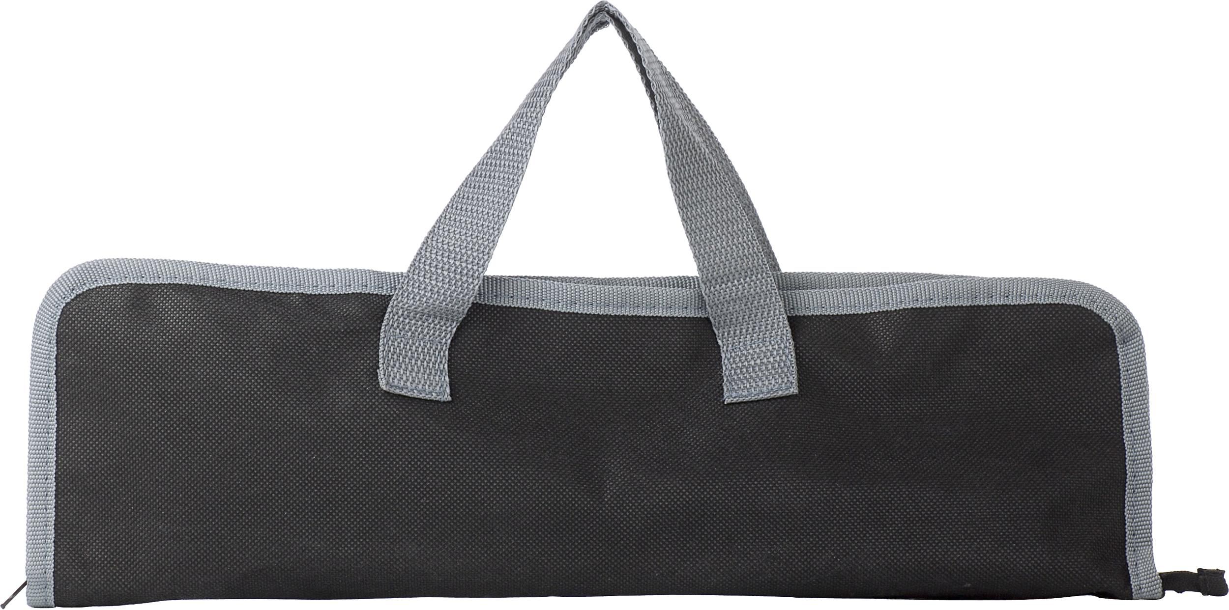 Set barbecue da 3 elementi in acciaio inox, composto da paletta, pinza e forchettone, custodia con manici in tessuto non tessuto 90 gr/m²