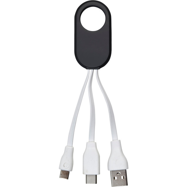 Set cavi per la ricarica, tre plug composti da connettori Type C e doppio Plug micro USB e lightning, lunghezza cavo ca. 5,5 cm, si collega a un supporto ovale con apertura (Ø 1,8 cm)
