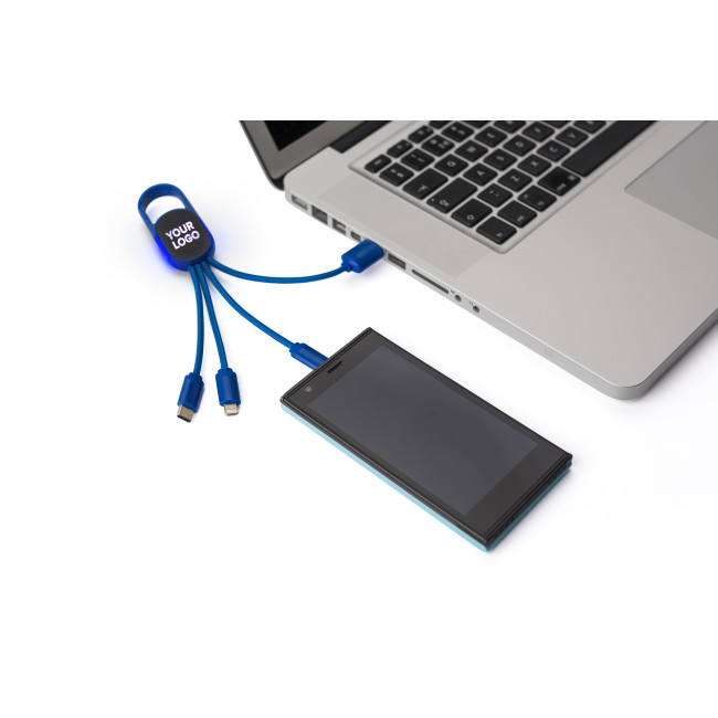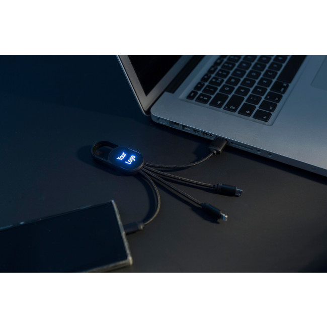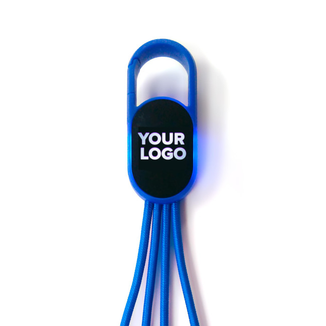 Set cavi per la ricarica 4 in 1, comprende moschettone, connettori Type C, micro USB e lightning, dopo l’incisione laser, il logo si accende quando il cavo è in uso