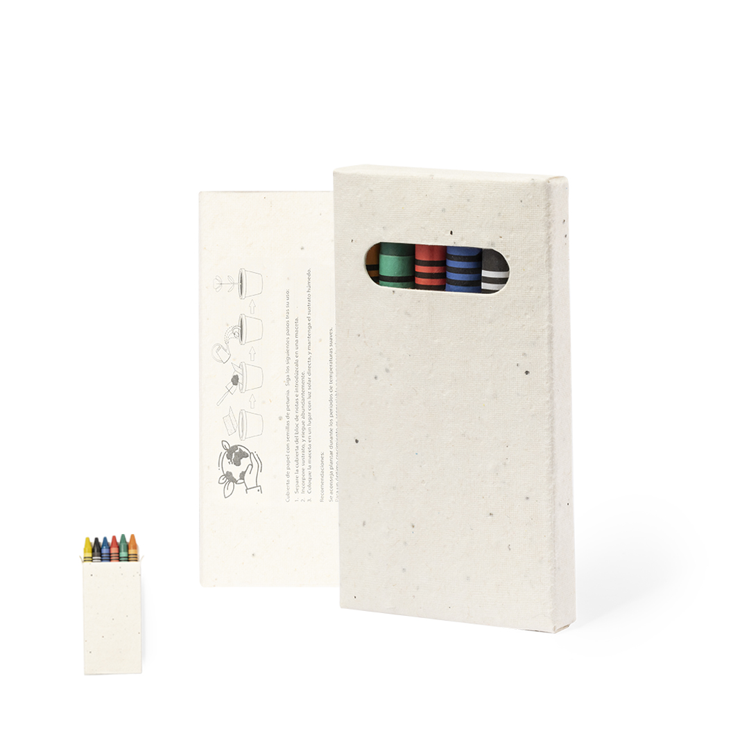 Set di 6 cere in un'ampia gamma di colori, presentate in una scatola di cartone naturale. Include semi di petunia, rendendo il cartone piantabile alla fine della sua vita utile. Ogni confezione è dotata di istruzioni per la semina, offrendo un'esperienza creativa e sostenibile.