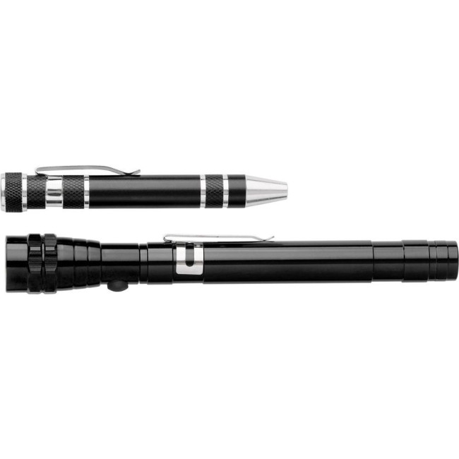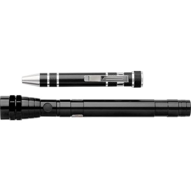 Set d'emegenza, composto da torcia in alluminio telescopica con tre luci LED, flessibile, kit cacciaviti con diverse punte intercambiabili, confezione regalo, batterie incluse