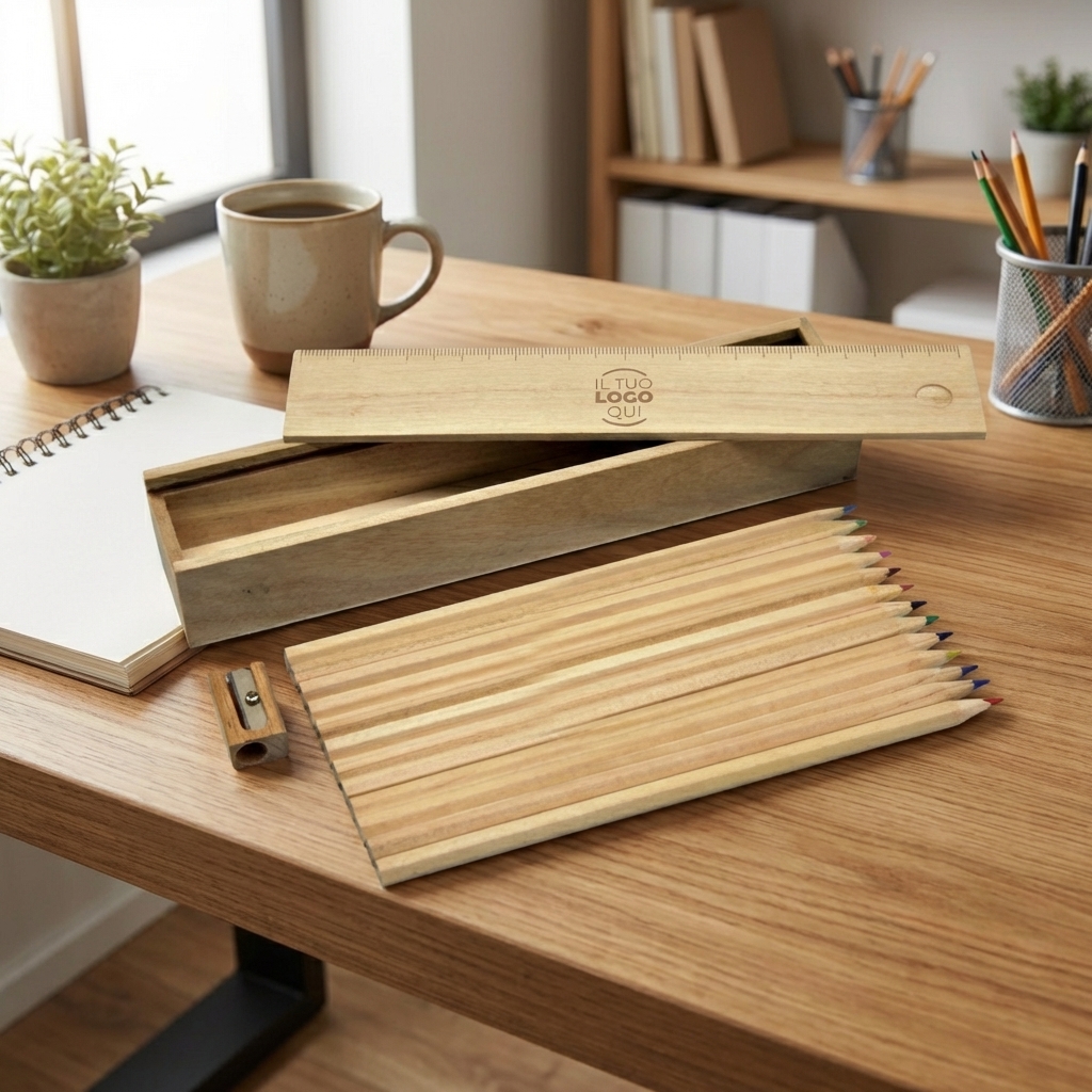 Portamatite realizzato in legno naturale, composto da 12 matite colorate, un temperino e un righello. Con un formato di 20,8x3,2x4,5 cm, è perfetto per mantenere tutto in ordine e a portata di mano, ideale per artisti e studenti.