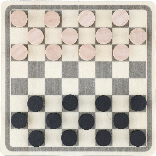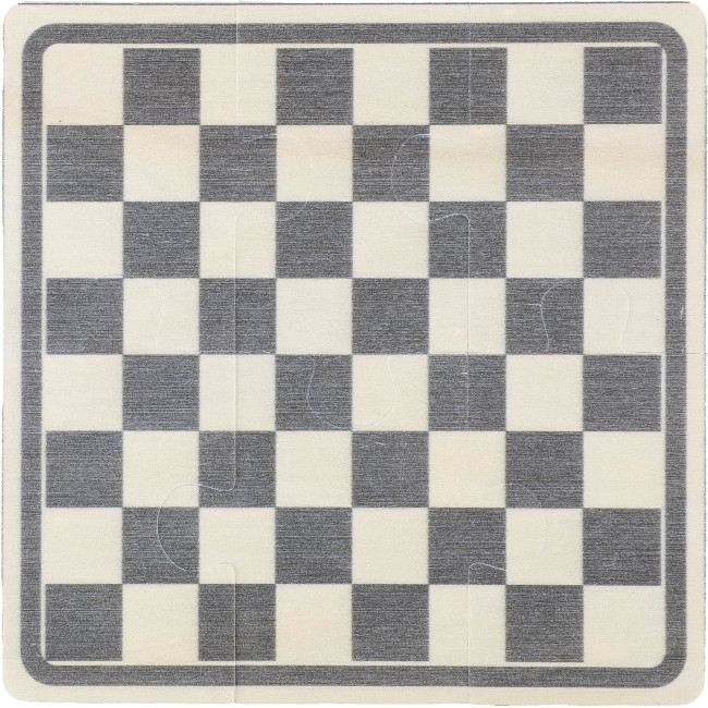 Set Gioco scacchi e dama in legno, custodia in cotone con chiusura a coulisse, include puzzle stampato da 6 pezzi (campo da gioco nero/naturale) per assemblare le tavole da gioco, e 16 fiches in legno stampate con disegni giocatori di scacchi, le fiches in legno sono disponibili nei colori naturale e nero, include istruzioni di gioco, etichetta all'interno della busta, il campo da gioco è realizzato in polipropilene e le fiches sono in legno di pino