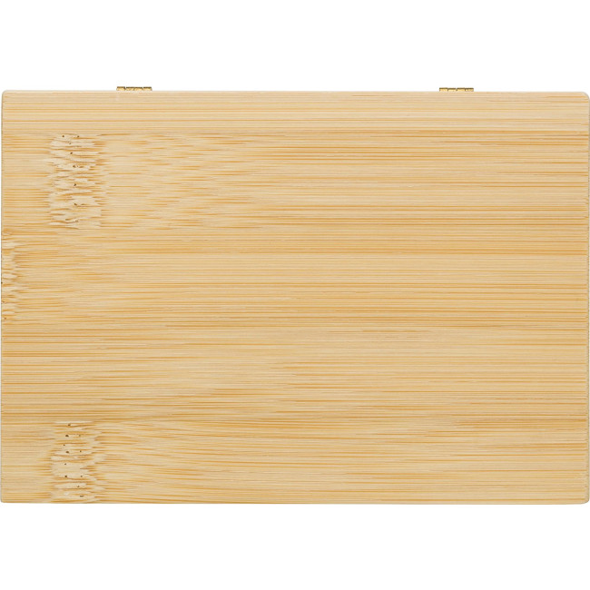 Set manicure in bambù composto da 4 pezzi, include forbici, tagliaunghie, pinzetta e lima, confezionato singolarmente in una scatola in cartone avana