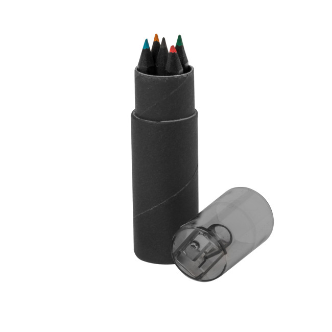 Set di 6 matite in legno rifinite in nero, con corpo esagonale e mina in vari colori. Presentate in una scatola cilindrica di cartone riciclato, dotata di cappuccio trasparente e temperamatite integrato, per un utilizzo pratico e sostenibile.