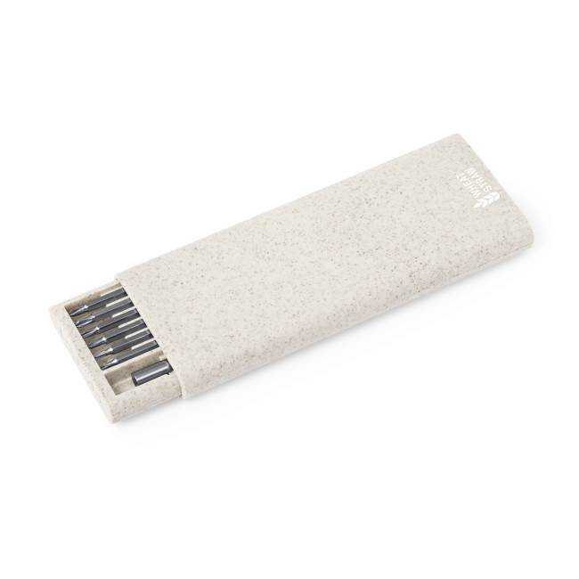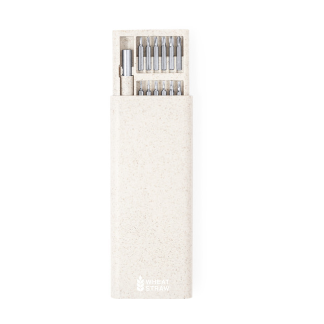 Set di utensili Zephyr realizzato in fibra di grano, comprende un cacciavite di precisione e 24 accessori vari. La confezione kraft e il design eco-friendly lo rendono una scelta sostenibile, mentre la struttura fustellata assicura una perfetta aderenza durante l'uso.