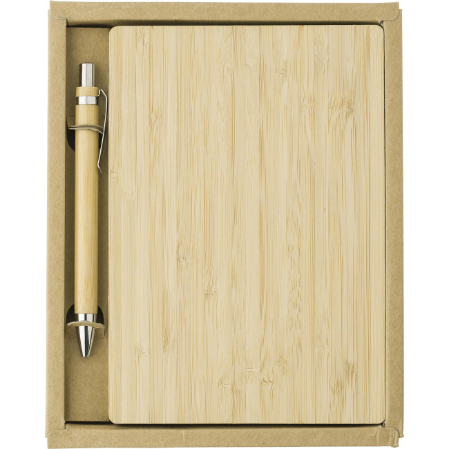 Set scrittura confezionata singolarmente in una scatola di carta kraft, composto da taccuino con copertina in bamboo, formato +/- A5, 128 pagine a righe con notifica della data, penna a sfera in bamboo (codice 3804), refill blu