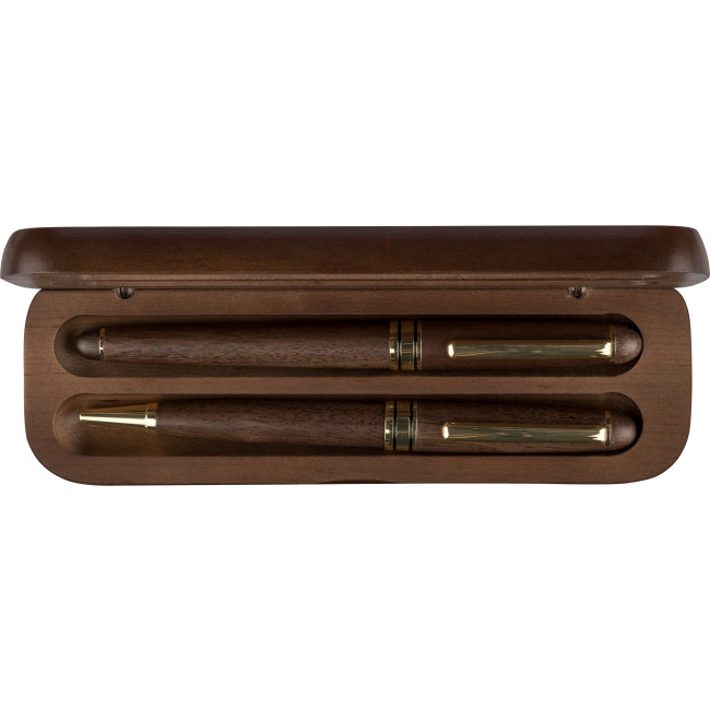 Set scrittura in legno di noce ed ottone, composto da penna a sfera twist con punta, clip e dettagli in metallo e rollerball, entrambe con inchiostro German Ink Dokumental, la penna a sfera ha una lunghezza di scrittura di circa 1.000 metri, il rollerball fino a 400 metri, fornito in comodo astuccio in legno di acero e cartone avana, refill blu.