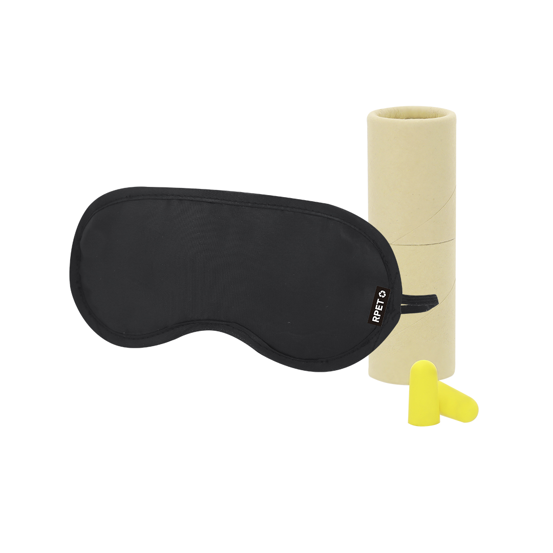 Set da viaggio composto da una maschera per gli occhi in RPET morbido e tappi per le orecchie, entrambi progettati per garantire comfort e protezione. La maschera presenta una regolazione elastica in tinta e un'etichetta distintiva. Il tutto è racchiuso in una custodia cilindrica in cartone kraft, realizzata con materiali sostenibili per ridurre l'impatto ambientale. Questo prodotto è personalizzabile con logo.