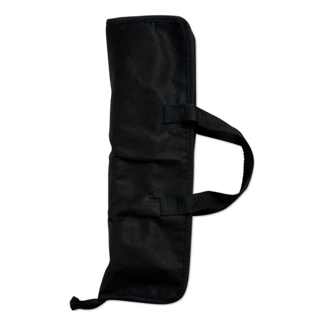 Set di tre accessori in acciaio: spatola, pinza e forchettone. Confezione in TNT nera con chiusura zip.