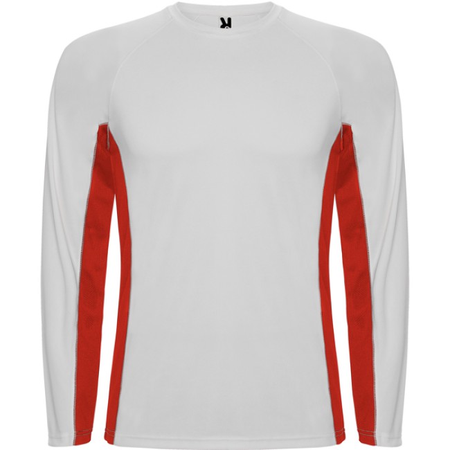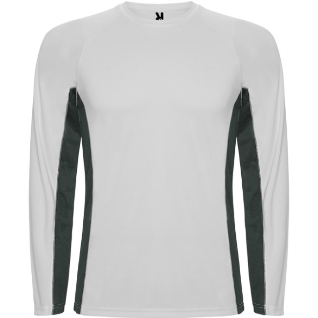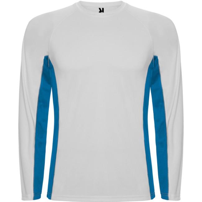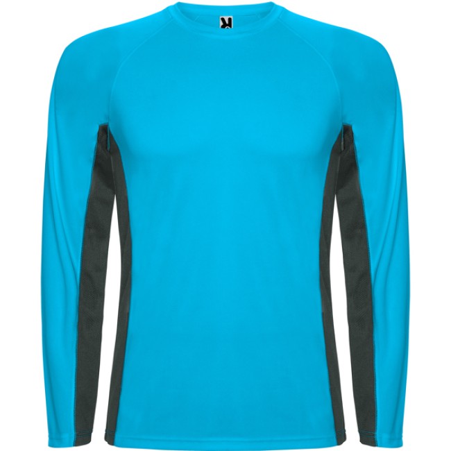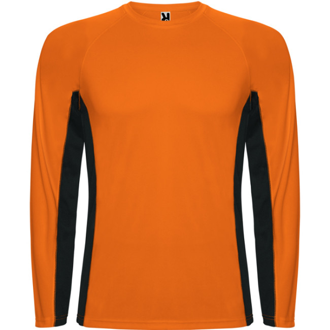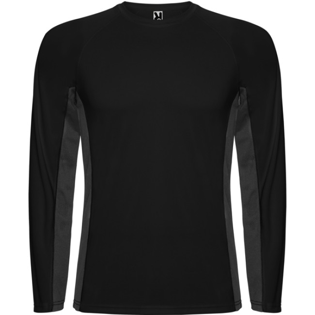 T-shirt tecnica realizzata con due tessuti di poliestere. Maniche lunghe stile raglan. Tessuto principale occhio di pernice, pannelli laterali e interni delle maniche con tessuto microforato. Girocollo con copri cuciture rinforzate al suo interno. T-shirt con tessuto confortevole e facilmente adattabile al corpo.