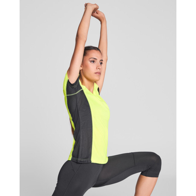 T shirt tecnica con due tessuti in poliestere, maniche corte stile raglan. Tessuto principale occhio di pernice, fasce laterali e interni della manica con tessuto microforato. Girocollo con copri cucitura di rinforzo all'interno. T-shirt in tessuto comodo e facilmente adattabile al corpo.