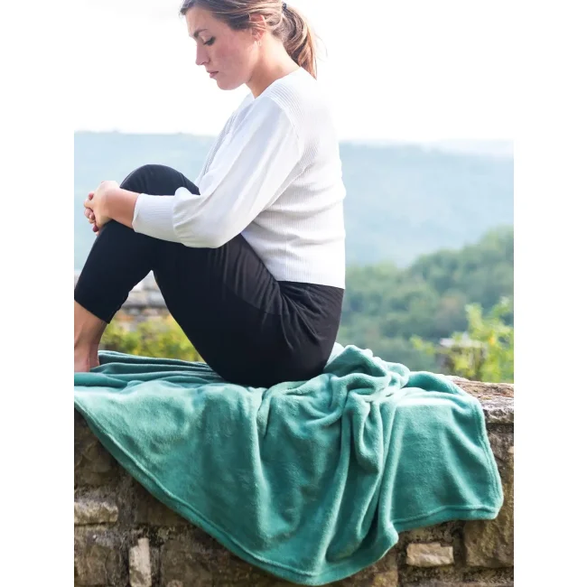100% poliestere. Coperta di pile sherpa monocolore, morbida e calda. Personalizzabile con ricamo. Dimensioni: 130x170 cm.