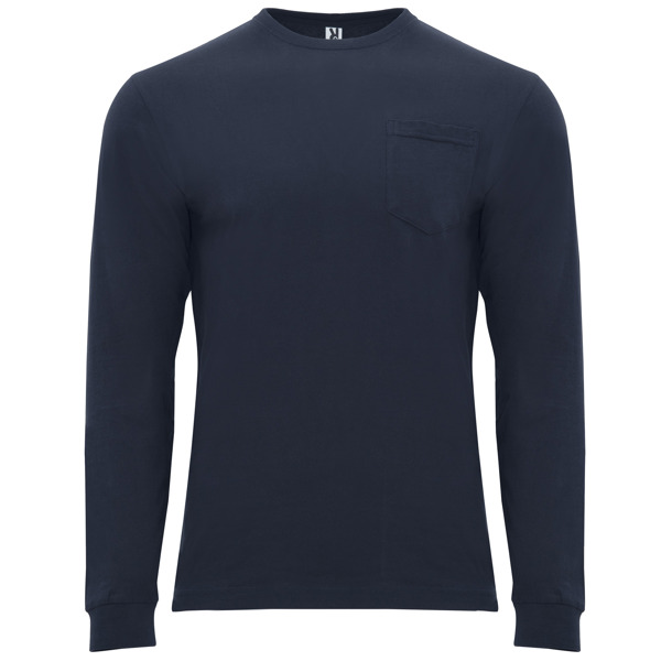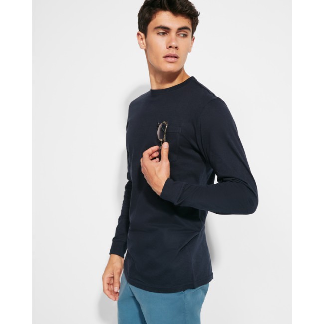 T-shirt manica lunga, girocollo e polsini in costina 1x1. Taschino sul lato sinistro del petto. Copri cuciture rinforzate su collo e spalle.