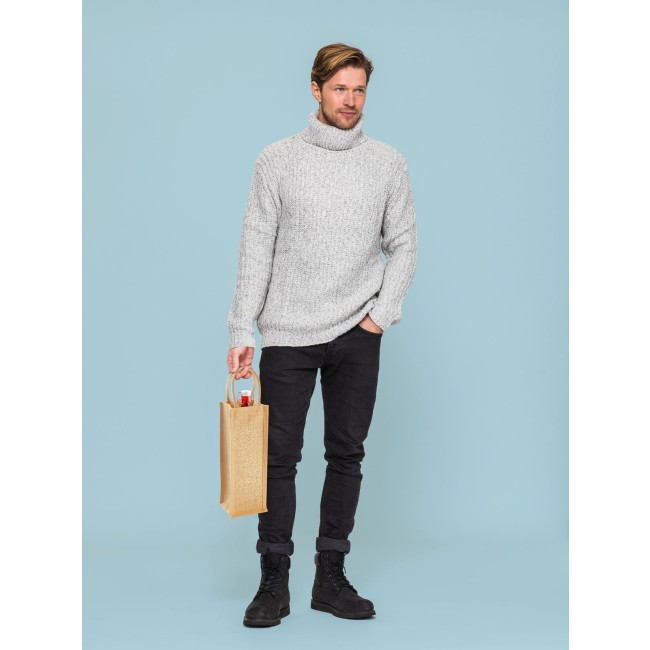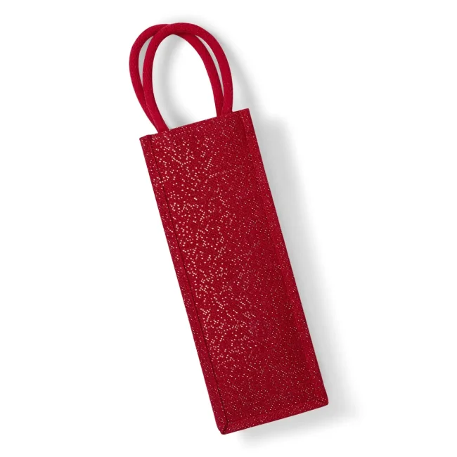 98% Juta laminata, 2% Fibra metallizzata. Borsa porta bottiglia. Etichetta removibile. Lunghezza manici: 29 cm, dimensioni: 12 x 35 x 11 cm, capacita': 4 litri, area stampabile: 8,5 x 24 cm.
