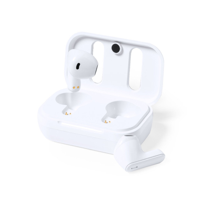 Cuffie in-ear Bluetooth®, realizzate in RABS in un elegante colore bianco, con il coperchio della base di ricarica rivestito in pelle riciclata.Connessione Bluetooth® 5.1, funzione vivavoce e batteria da 30 mAh. Design ergonomico, con pulsante di controllo a sfioramento integrato su ciascun auricolare e luce di stato di ricarica a LED. Base di ricarica abbinata con batteria da 300 mAh. Include un cavo di ricarica di tipo C e un manuale di istruzioni in inglese e spagnolo. Confezionate in una scatola kraft di design.Il materiale RABS o ABS riciclato e la pelle riciclata provengono dal riciclo di articoli giunti al termine del loro ciclo di vita. I materiali riciclati utilizzati hanno la certificazione RCS, che ne garantisce l'origine riciclata.