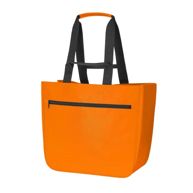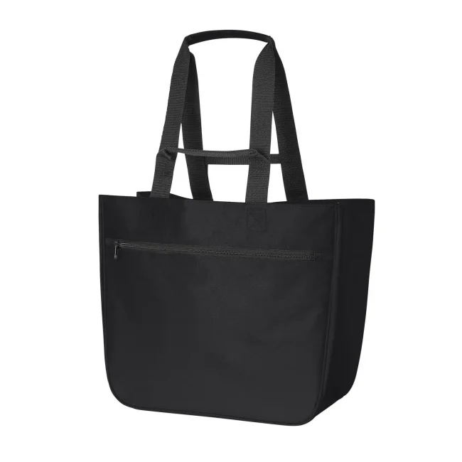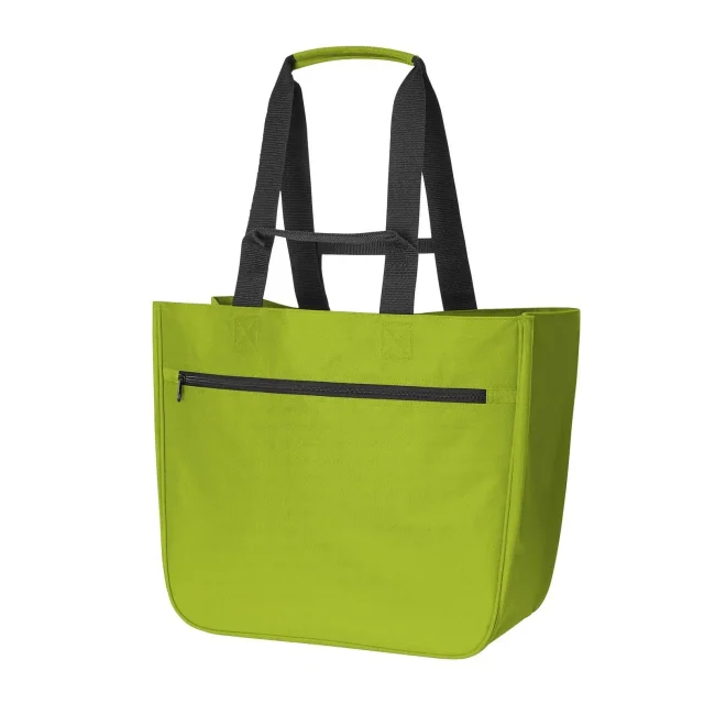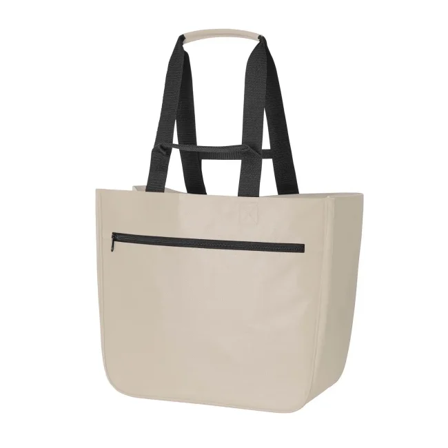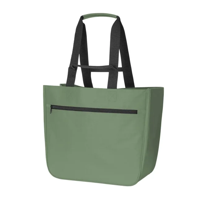 RPET 600d. rPET 600d/PE. Senza PVC. Shopper multiuso flessibile e spaziosa, testata anche per uso alimentare, ampio vano principale con piedini di base, tasca frontale con zip, doppi manici e manico imbottito. Dimensioni: 40/44x37x20 cm, capacità: 30 lt.