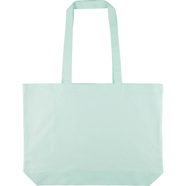Shopping bag in cotone Oeko-Tex® 140 g/m², soffietto da 10 cm e manici lunghi 70?cm e larghi 2,5?cm, cotone in colori pastello in PMS 9562U (verde), 162U (arancione), 317U (blu) e 522U (viola), etichetta Oeko-Tex® inclusa.