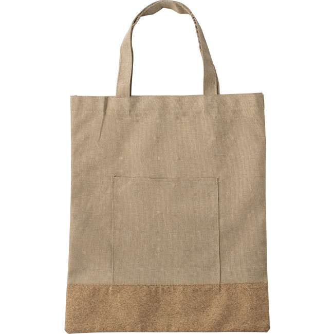 Shopping bag in poliestere 600 D RPET, manici corti, base in sughero, colore naturale, piccola tasca sul davanti, etichetta RPET