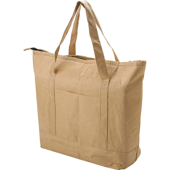 Shopping bag in carta laminata 80 g/m², pellicola argentata refrigerante interna, vano principale chiusura lampo, borsellino interno 16,8 x 15,6 cm