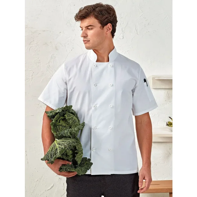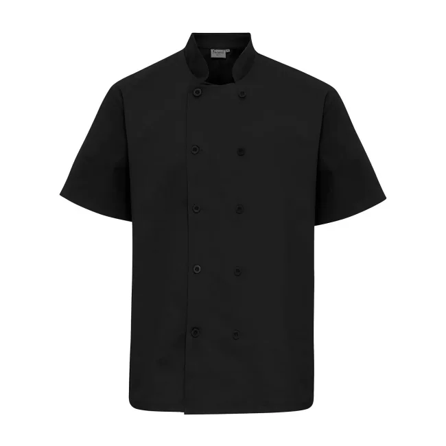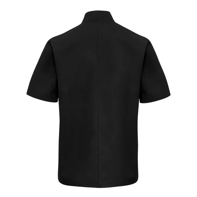65% poliestere 35% cotone twill. Giacca da cuoco a manica corta con collo alla coreana, chiusura a strappo con dieci bottoni, bottoni in resina di alta qualità, di lunga durata, tasca per penne a sinistra, taglia unisex. Lavabile a 60°C.