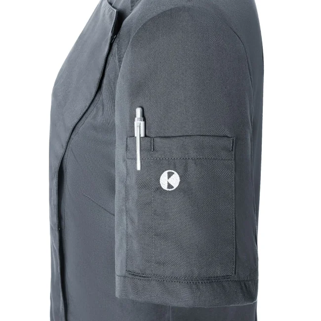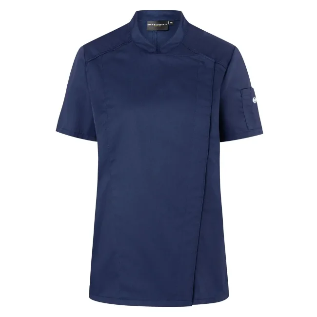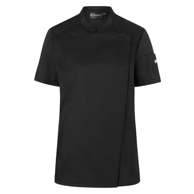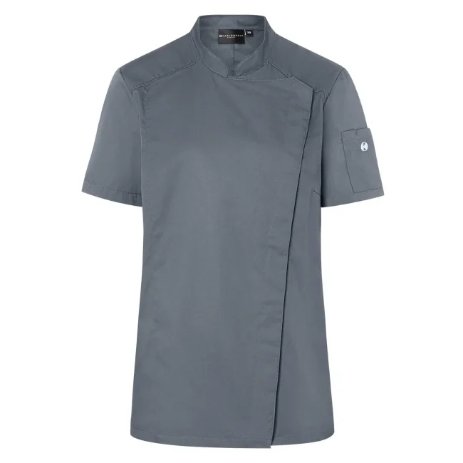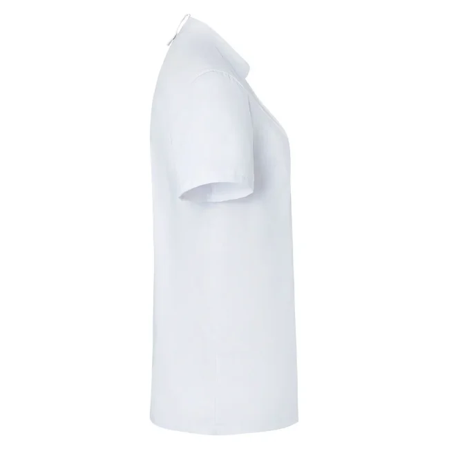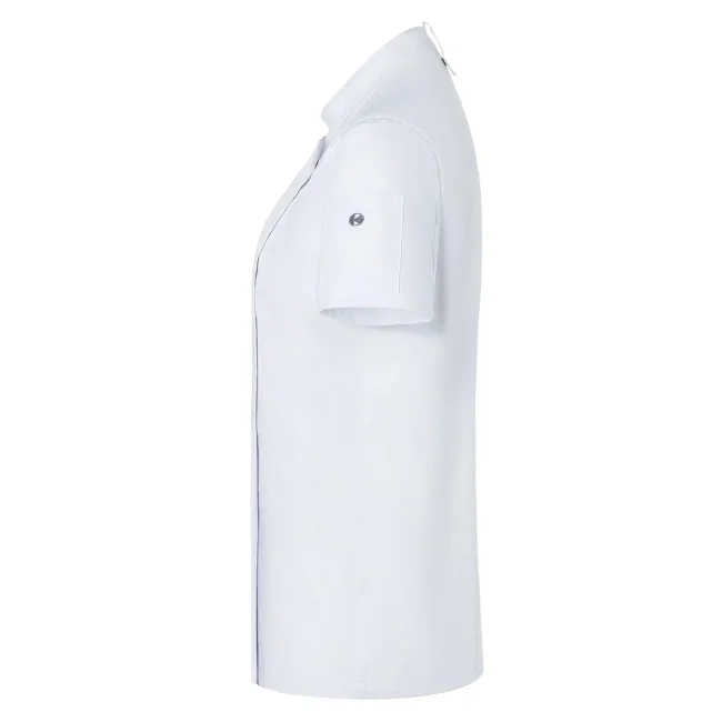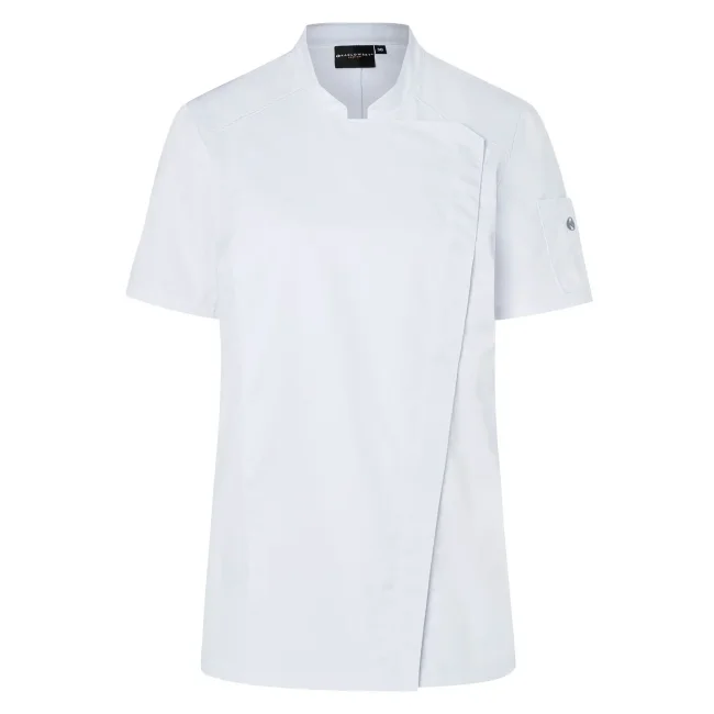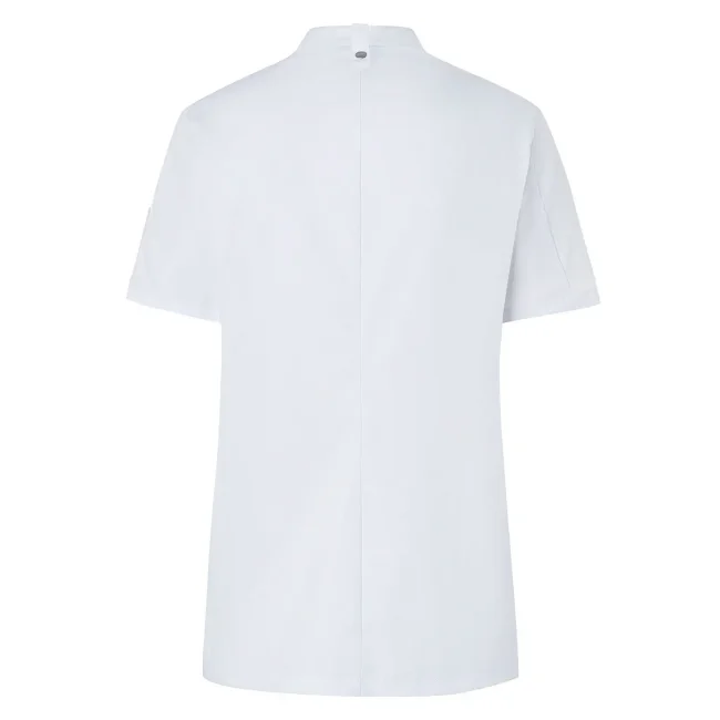 50% poliestere 50% cotone, 150 g/m². Giacca da cuoco da donna in tessuto rifinito, irrestringibile e easy-care, maniche corte, slim fit. Bottoni a pressione, pratico passante sul retro del colletto per tenere fermo il grembiule, tasca applicata sulla manica sinistra con portapenne. STANDARD 100 by OEKO-TEX®.