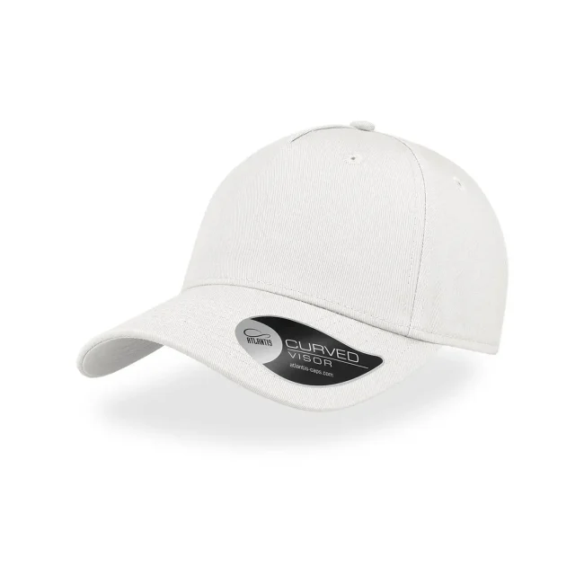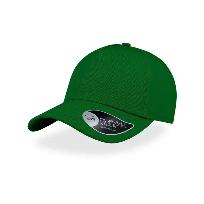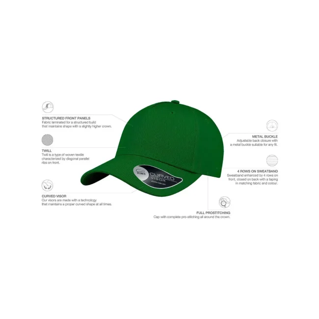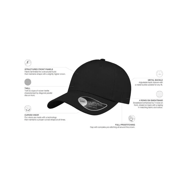 100% Cotone Twill. Cappellino a 5 pannelli sportivo. Grazie all'ampia corona frontale è ideale per le personalizzazioni. Visiera curva, occhielli ricamati, 6 cuciture sulla visiera, chiusura con fibbia in metallo, etichetta removibile.