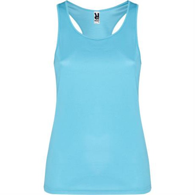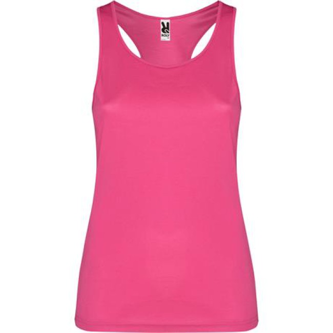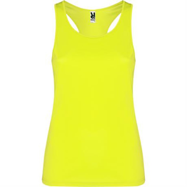 Canotta sportiva con giromanica e scollo doppia cucitura. Spalline incrociate sulla schiena e cuciture laterali.
