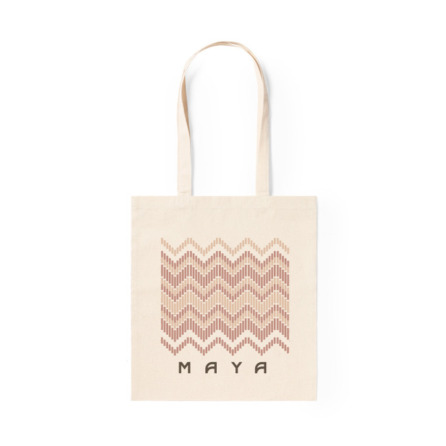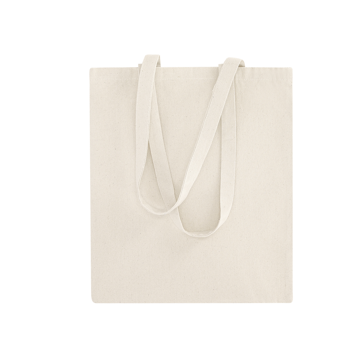Shopper in robusto materiale cotone 140g/m2 con finitura in colore naturale. Con manici lunghi 70 cm e finiture cucite. Resistenza fino a 7 kg di peso.