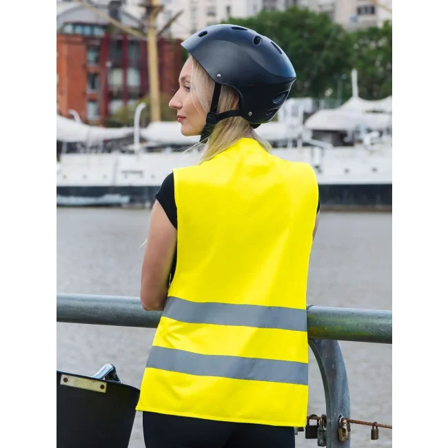 100% poliestere. Gilet di sicurezza Basic. Certificato secondo la norma EN ISO 20471:2013 + A1:2016, Oeko-Tex® Standard 100. Due fasce riflettenti da 5 cm intorno al corpo, misura regolabile grazie alla doppia chiusura in velcro, durata delle proprietà riflettenti come previsto dalla normativa EN per 25 cicli di lavaggio a 40°C. Confezionato singolarmente.
