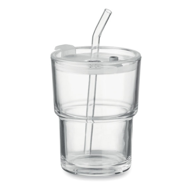 Bicchiere in vetro con coperchio e cannuccia in vetro rimovibile. Presa per cannuccia e coperchio con apertura diretta della bevanda senza perdite. Capacità 400 ml.
