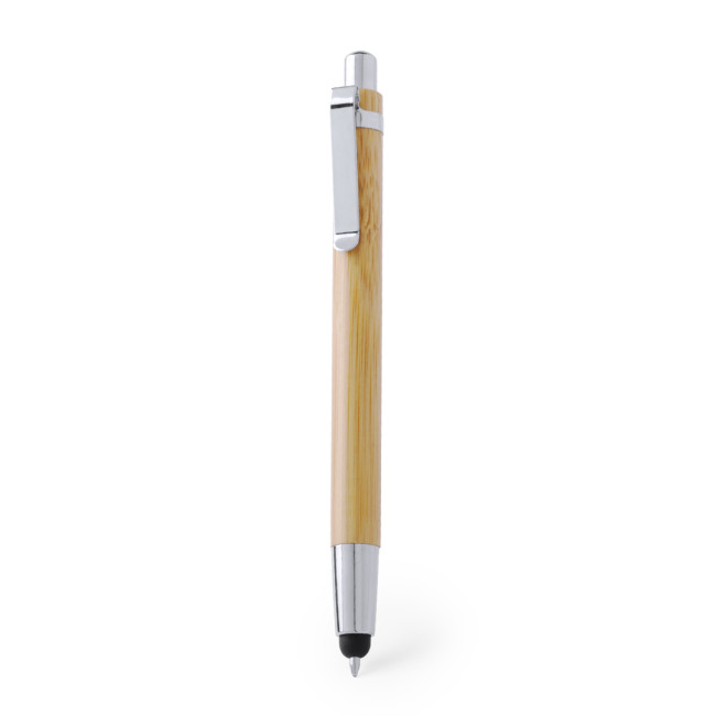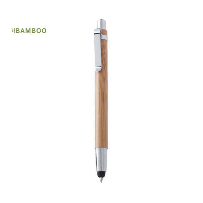 Elegante penna touch con meccanismo a pulsante, fusto in legno di bambù naturale e finiture in argento lucido metallizzato. Con cartuccia jumbo e inchiostro blu.