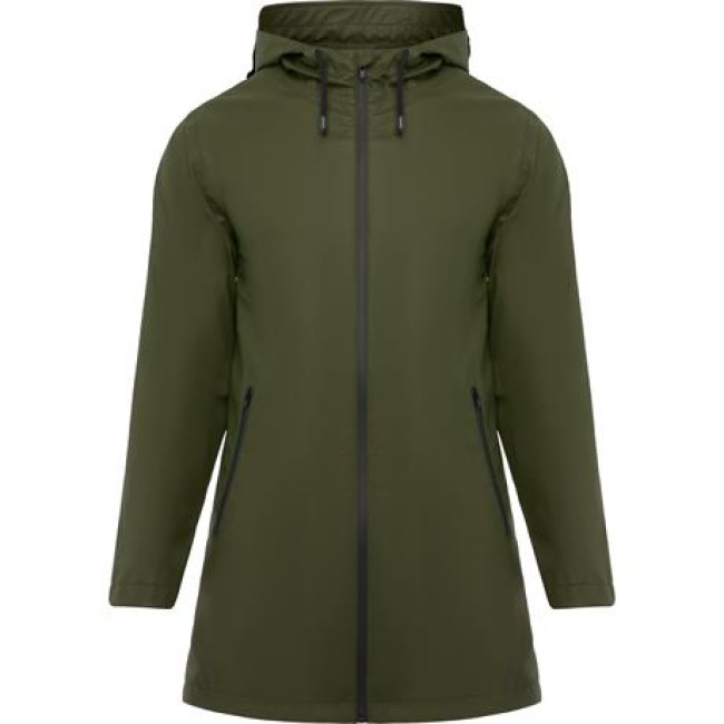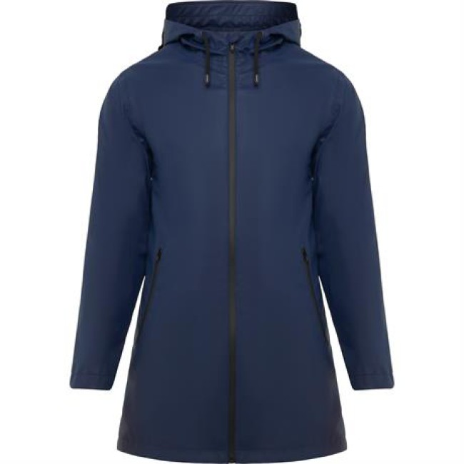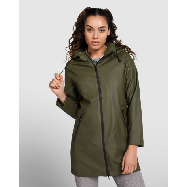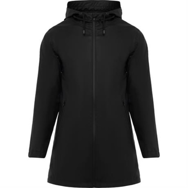 Giacca da pioggia impermeabile da donna.Cappuccio fisso con visiera.Zip centrale tono su tono con tirante.Dettagli in cotrasto nel colore nero.Due tasche laterali.Parte bassa posteriore con apertura.
