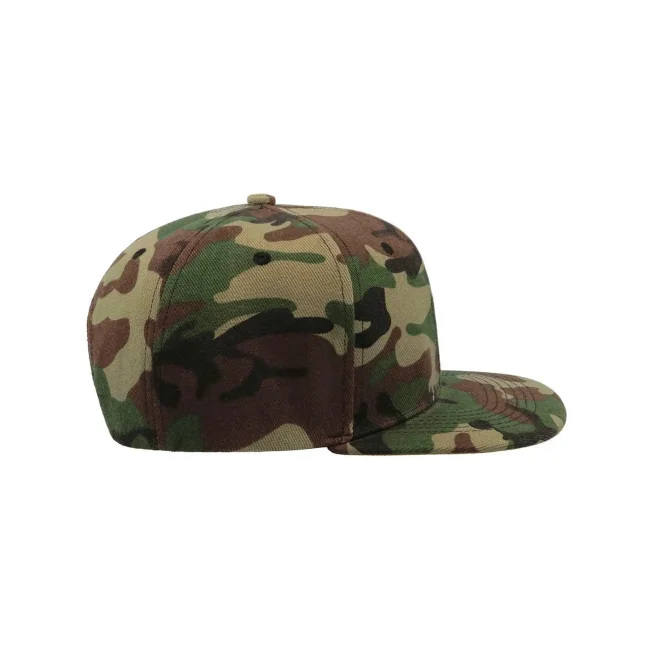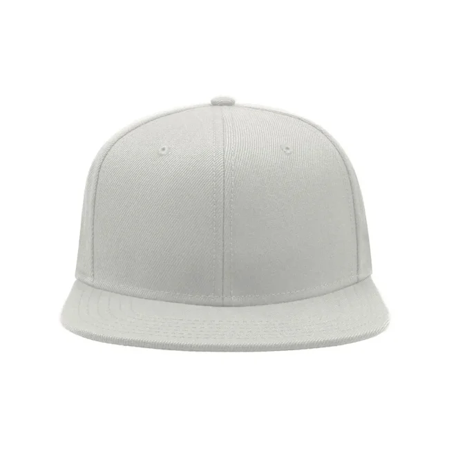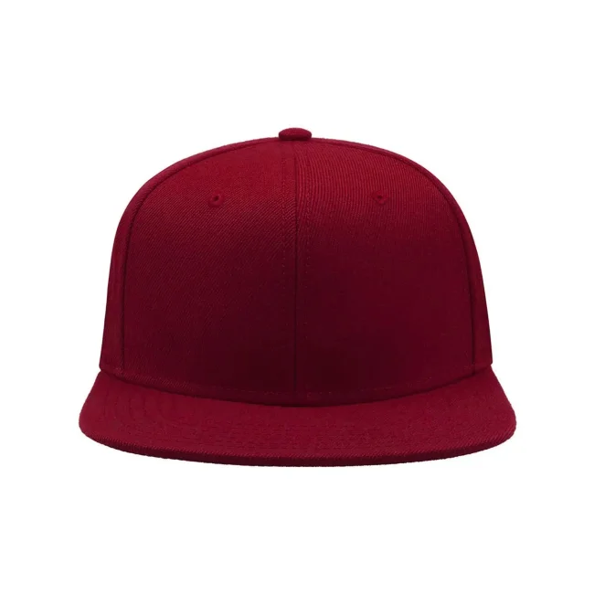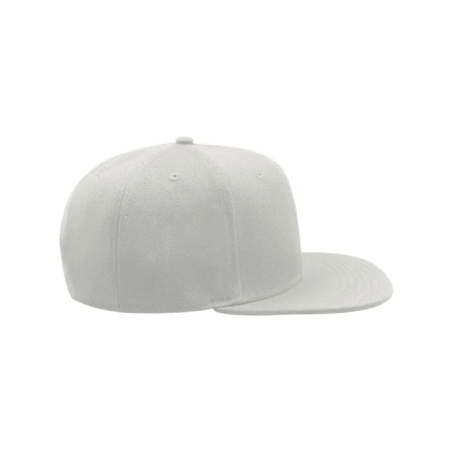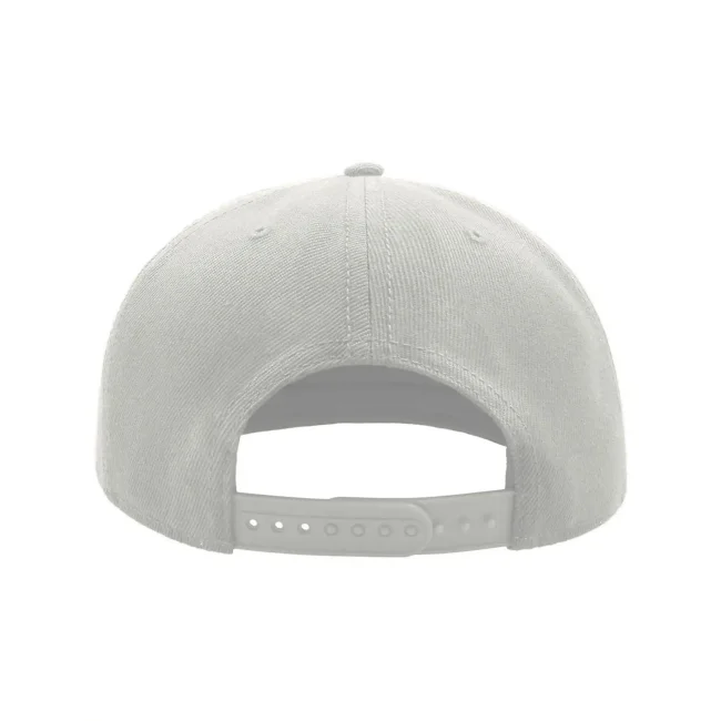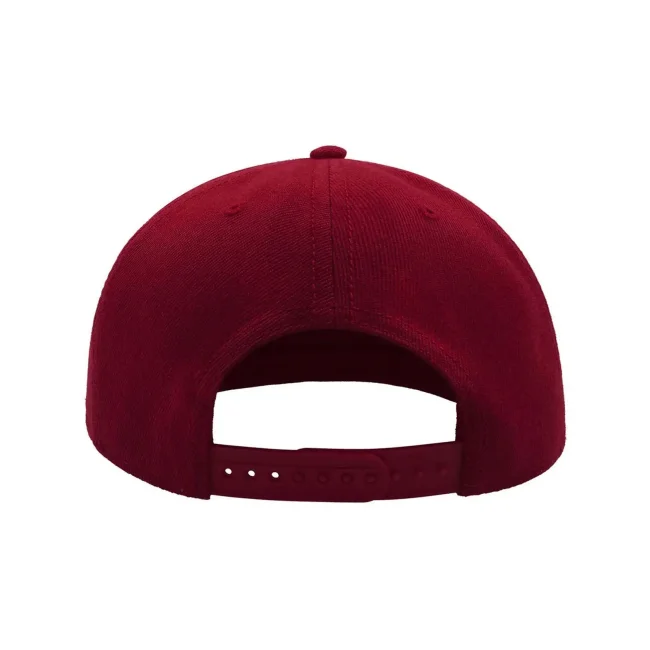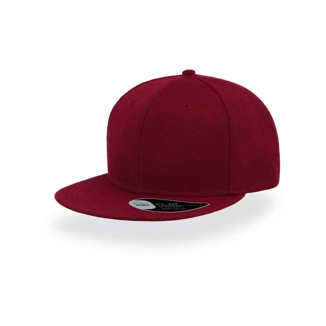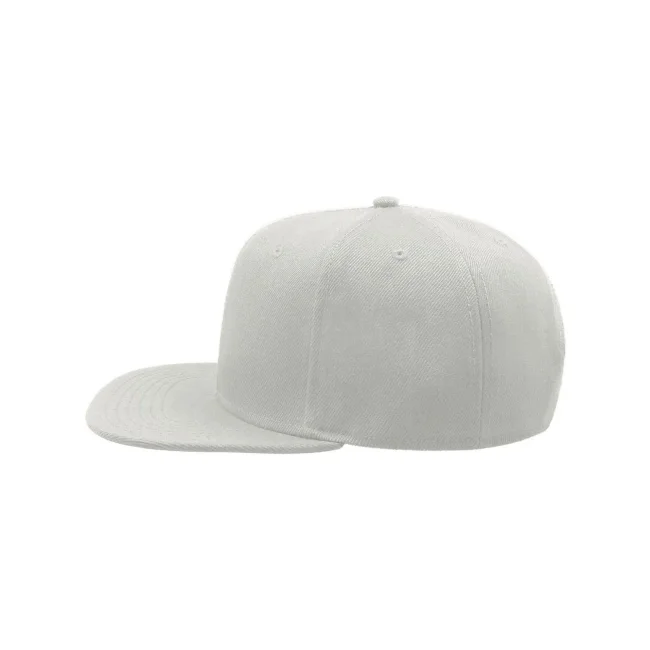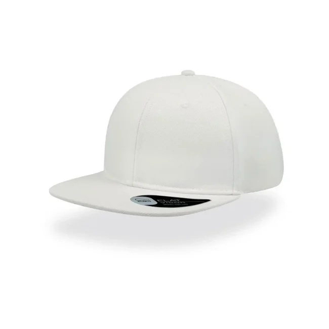 100% acrilico twill. Cappellino a 6 pannelli con occhielli ricamati, visiera piatta, pannello frontale rinforzato, adesivo sulla visiera, chiusura con cinturino in pvc, etichetta removibile, taglia unica.