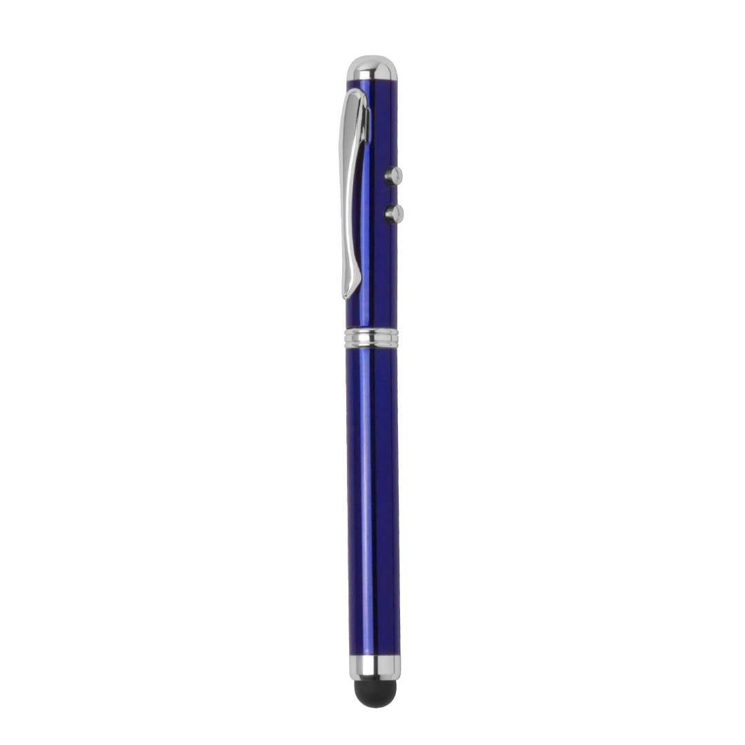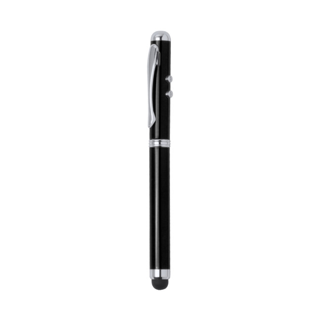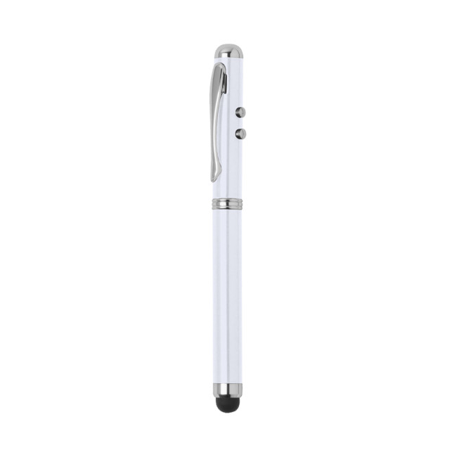 Penna laser in metallo con elegante finitura lucida, con pulsanti di attivazione laterali per le funzioni laser e torcia (batterie a bottone incluse). Refil blu, con puntatore tattile integrato, chiusura a cappuccio e clip cromata. Appositamente progettata per la stampa laser. Presentata in un'elegante custodia metallica e in scatola individuale di cartone argentato. Interno scatola in morbida spugna fustellata, con batterie di ricambio.