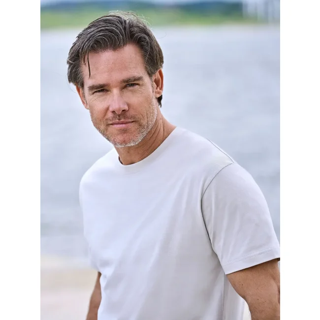 100% cotone pettinato ringspun. T-shirt a manica corta a doppio cotone preristretto, colletto a due strati con elastane, nastro di rinforzo da spalla a spalla, doppia cucitura, lavabile a 60 gradi. Heather Grey: 85% cot 15% viscosa.