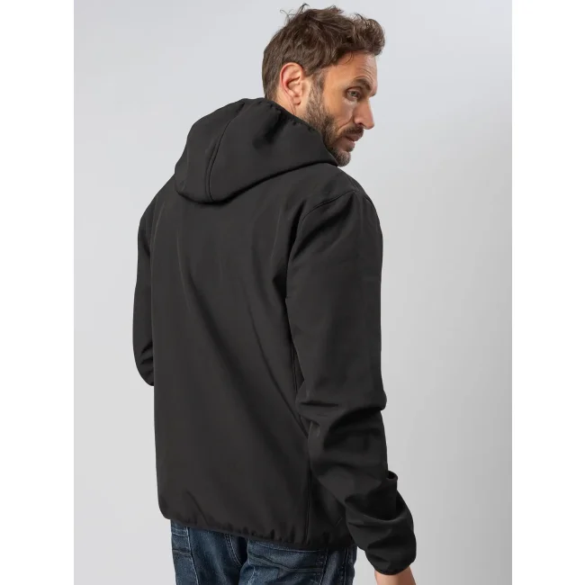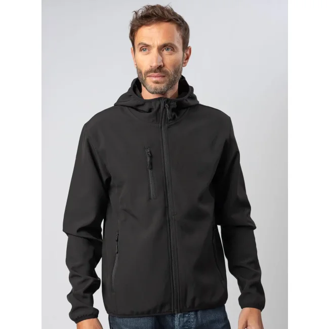 Softshell 3 strati con cappuccio, realizzato in poliestere riciclato ed elastan. Il tessuto morbido è progettato per resistere a vento e pioggia, con impermeabilità di 5000 w/p e traspirabilità di 500 mvp. Include tre tasche sul davanti con zip e una tasca interna. Il tira zip in plastica con fibra riflettente migliora la visibilità. Personalizzabile con logo.