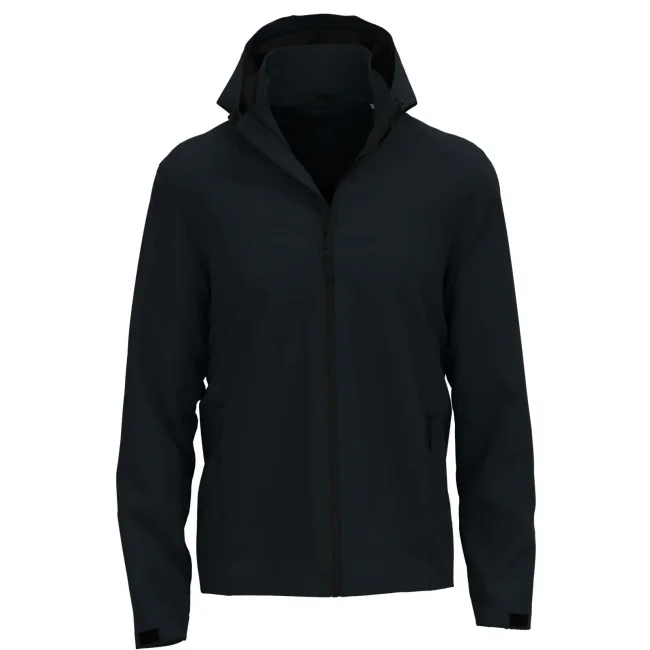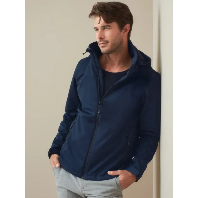 100% poliestere. Giacca softshell uomo con tessuto a 3 strati impermeabile (5.000 mm) e traspirante (1.000 g/m²), mezzaluna centrale posteriore per la personalizzazione, polsini e orlo regolabili, tasca interna, cappuccio rimovibile e regolabile, 2 tasche laterali con cerniere di alta qualita', bordo di protezione dal vento, etichetta Premium con la taglia tessuta sulla nuca, ed etichetta di manutenzione a strappo nella cucitura laterale, senza fluoro e PFC.