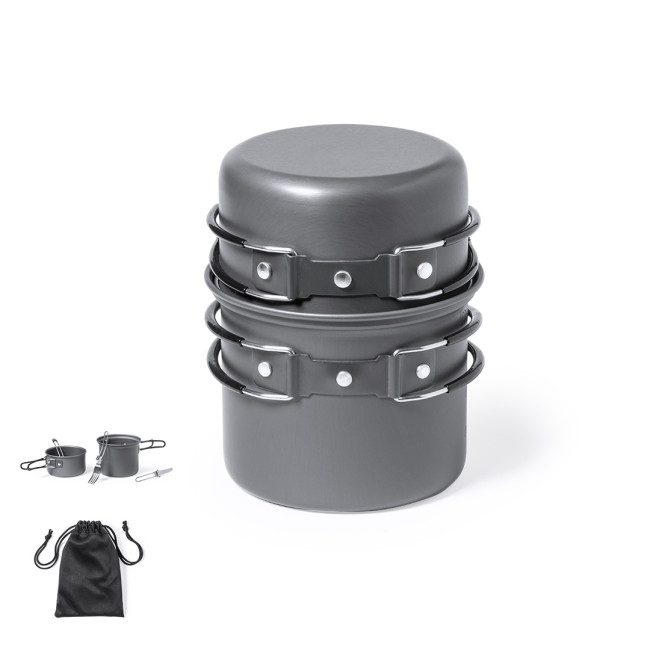 Set completo di utensili da campeggio di dimensioni ultracompatte. Confezionato in una robusta custodia in RPET con chiusura a coulisse, accessorio di montaggio ed etichetta esterna con logo RPET. Contenuti:1 casseruola in alluminio finitura grigio opaco. Capacità 800 ml diametro 13 cm x altezza 10 cm. Manici pieghevoli con protezione antiscottatura.1 casseruola in alluminio, finitura grigio opaco. Capacità 600 ml diametro 12 cm x altezza 6,5 cm. Manici pieghevoli con protezione antiscottatura.Cucchiaio, coltello e forchetta pieghevoli in acciaio inox. Con maniglia fustellata e serrature di sicurezza. Fornito in buste individuali in RPET con coulisse. Il materiale RPET delle buste è realizzato con plastica riciclata, per promuovere il riutilizzo dei rifiuti plastici e contribuire alla sostenibilità del pianeta.