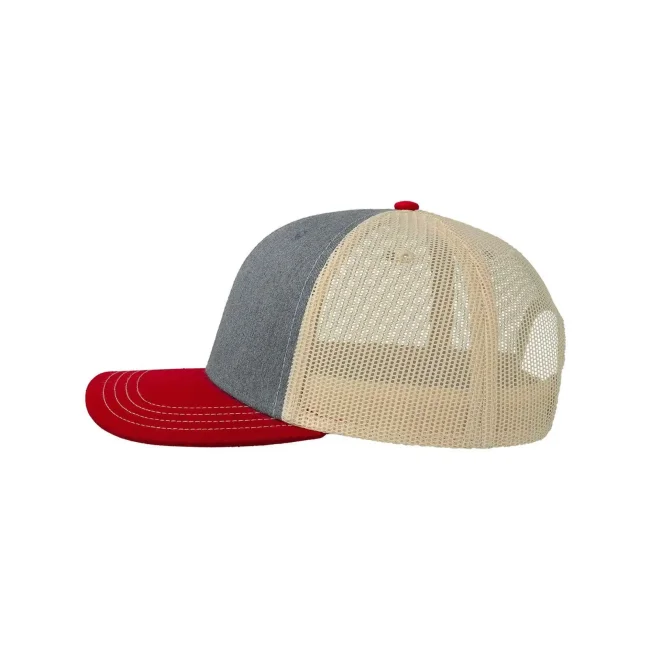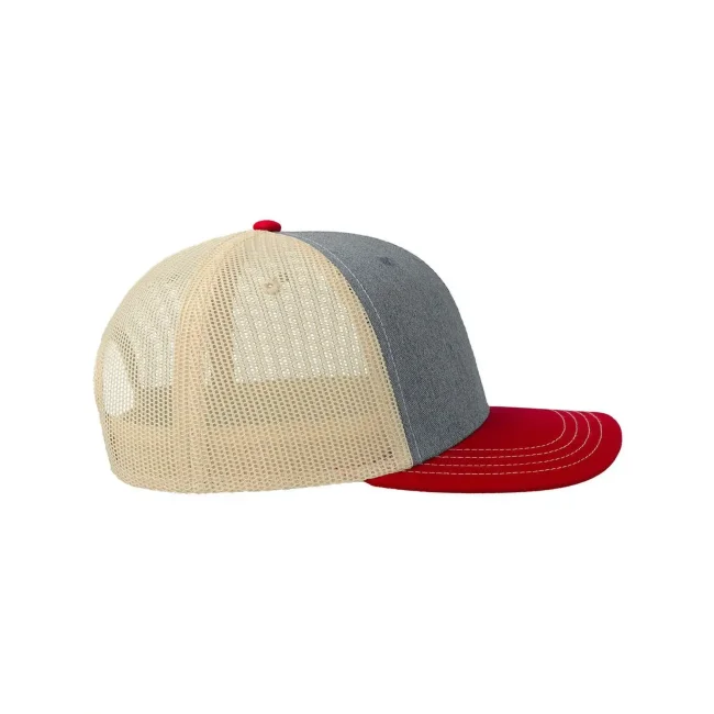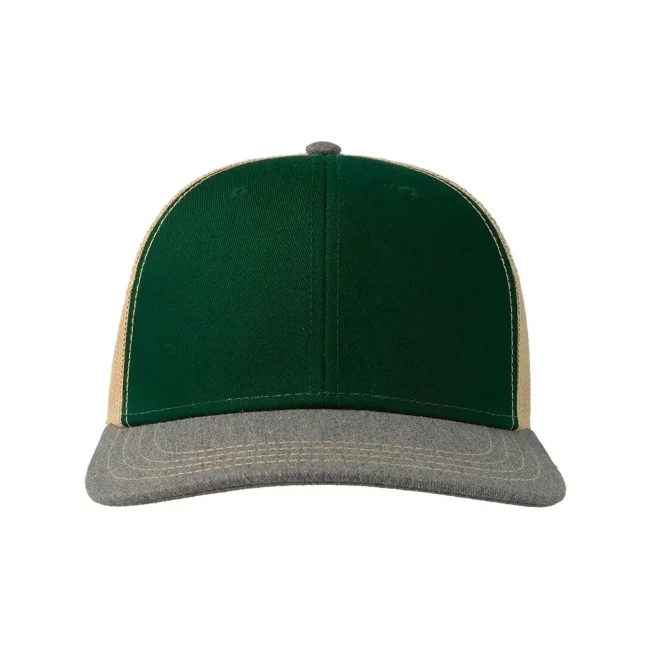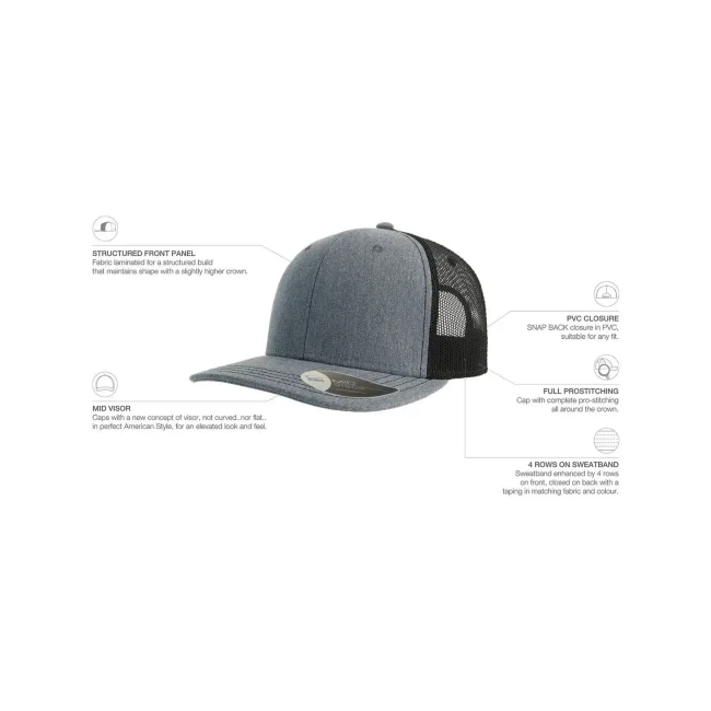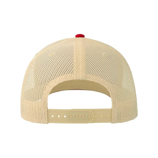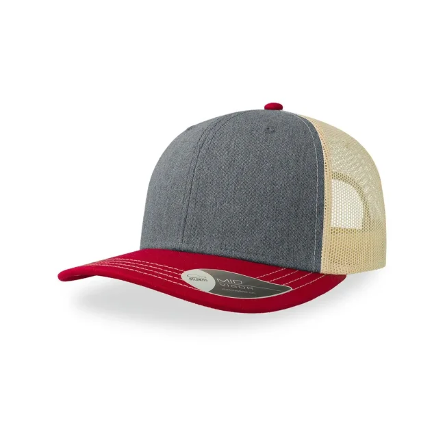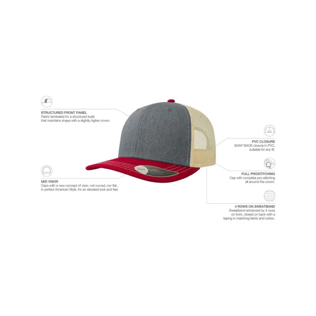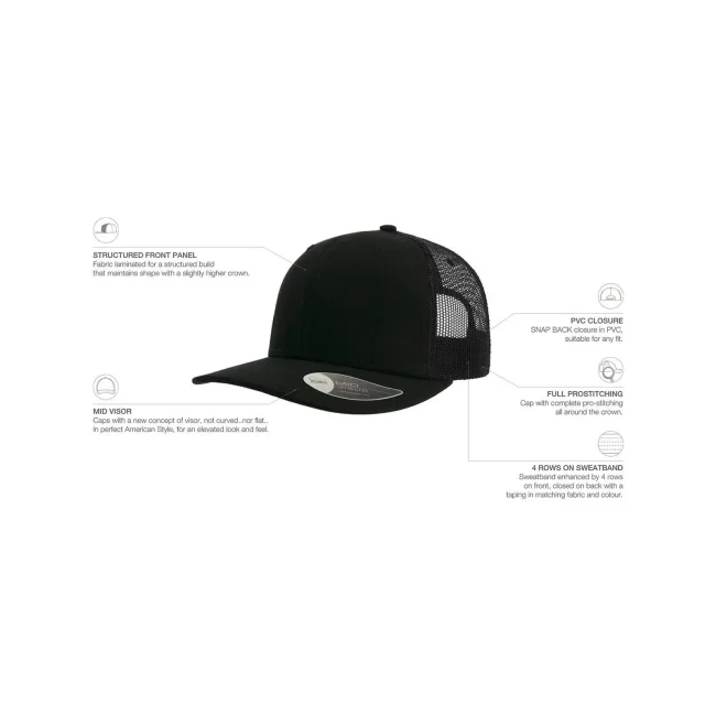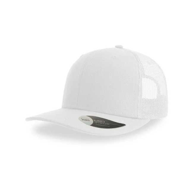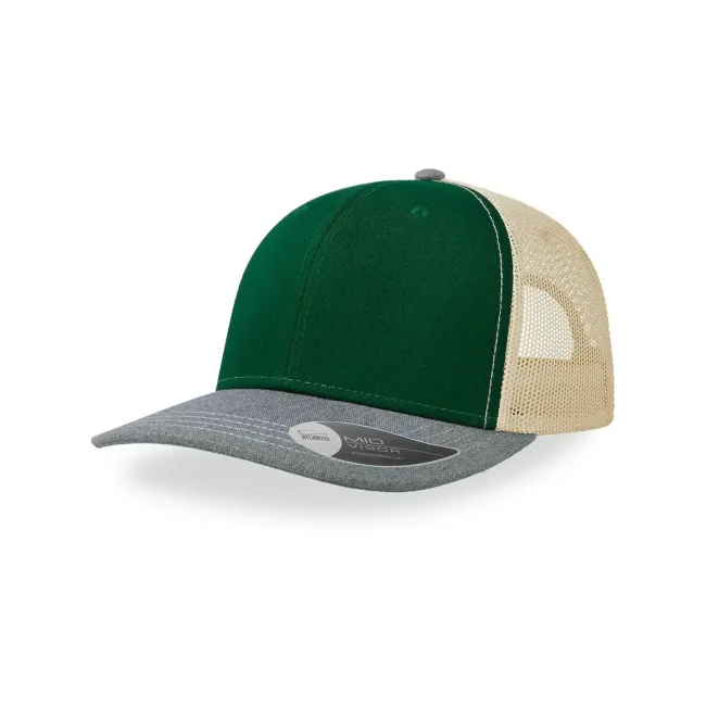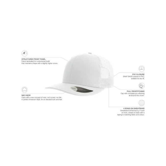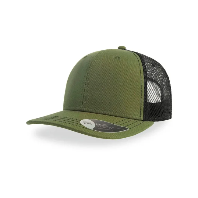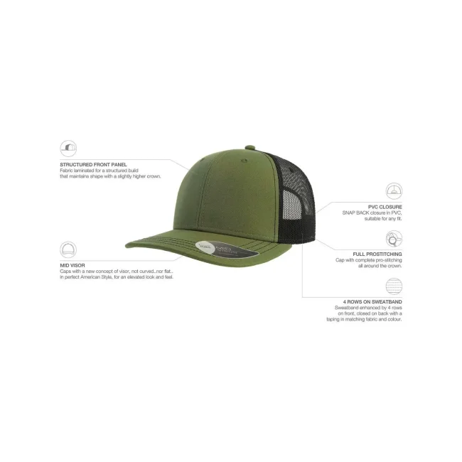 100% cotone twill chino. Tessuto laterale e retro: 100% poliestere. Cappellino a 6 pannelli, visiera precurvata e occhielli ricamati, chiusura in PVC, 4 cuciture sulla visiera, etichetta removibile.