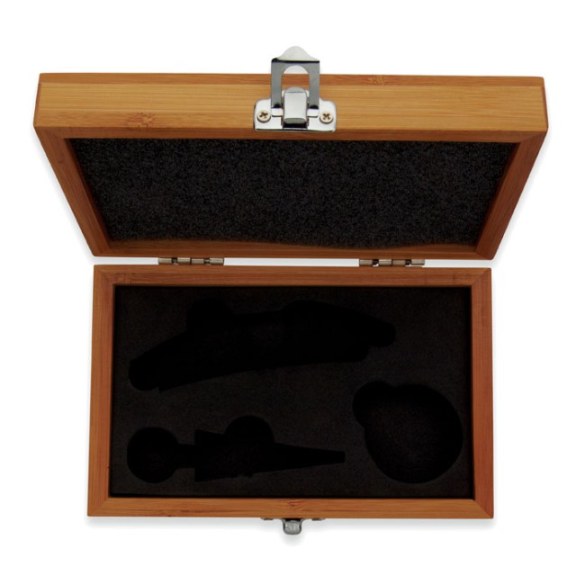 Set vino in scatola di bamboo che comprende un salvagoccia, un cavatappi, un tappo in acciaio inossidabile e bamboo.
