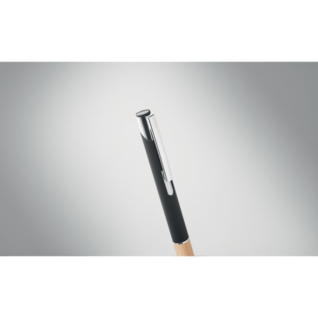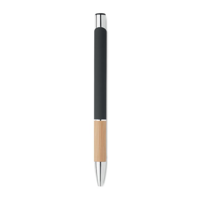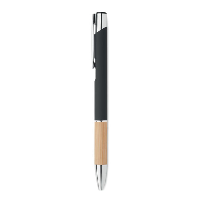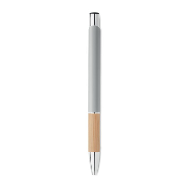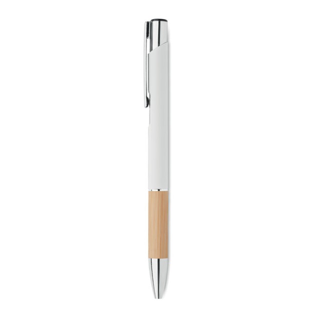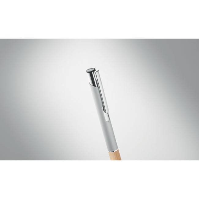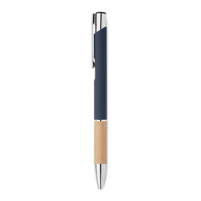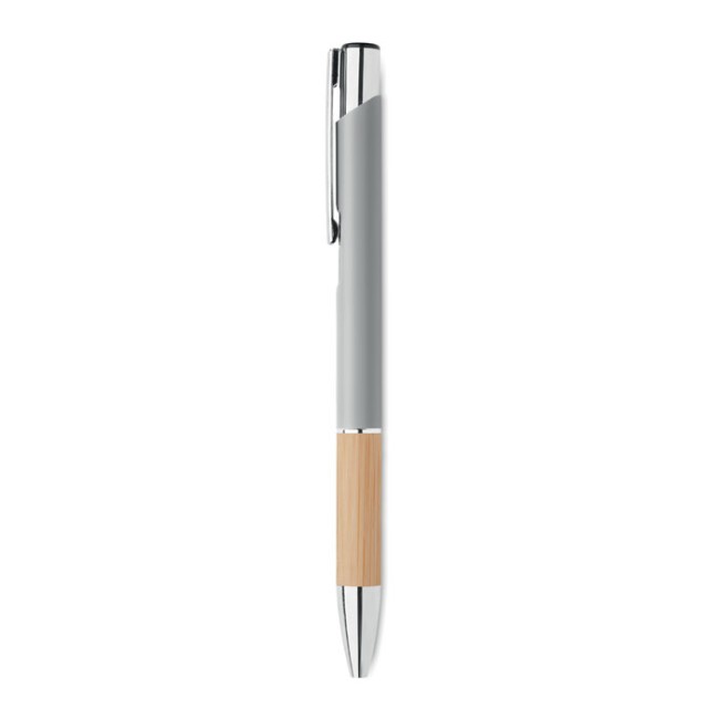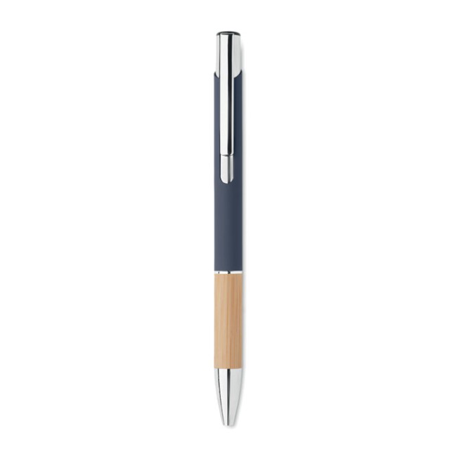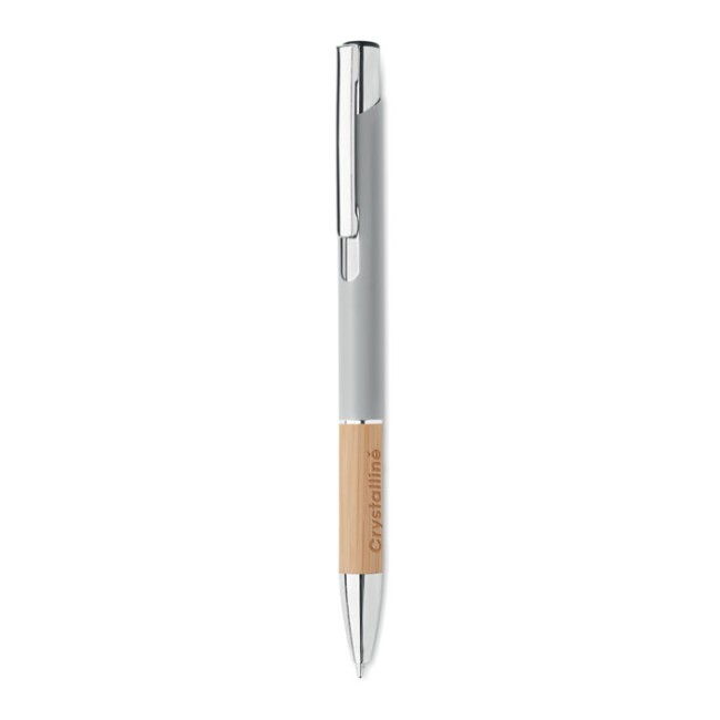 Penna a pulsante in alluminio con impugnatura in bamboo. Inchiostro blu.