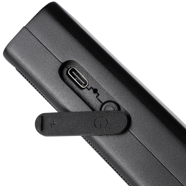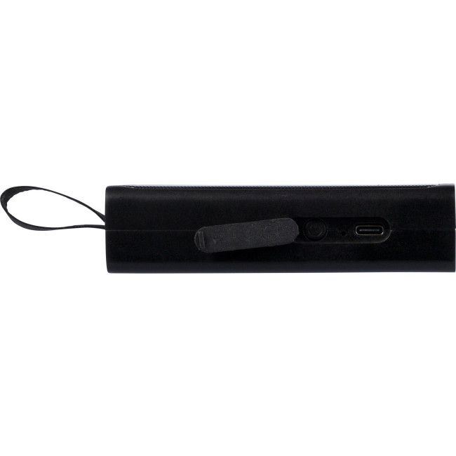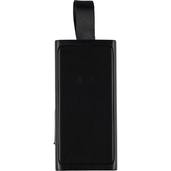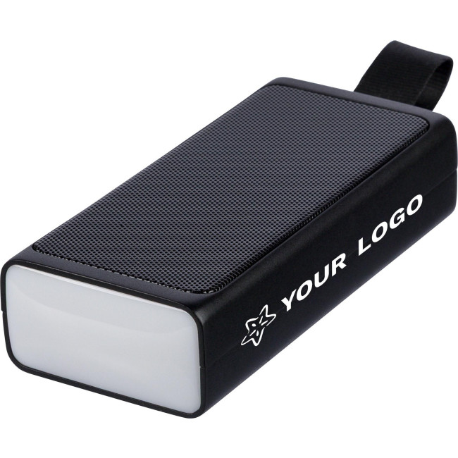 Speaker portatile in ABS riciclato da 5W, griglia metallica e torcia LED COB integrata, dotato di laccetto in silicone per il trasporto, tecnologia di connessione wireless 5.4, batteria da 500?mAh, ingresso 5V/500?mA, progettato per uso esterno, presenta logo materiale "riciclato", confezionata singolarmente in una scatola in cartone avana.