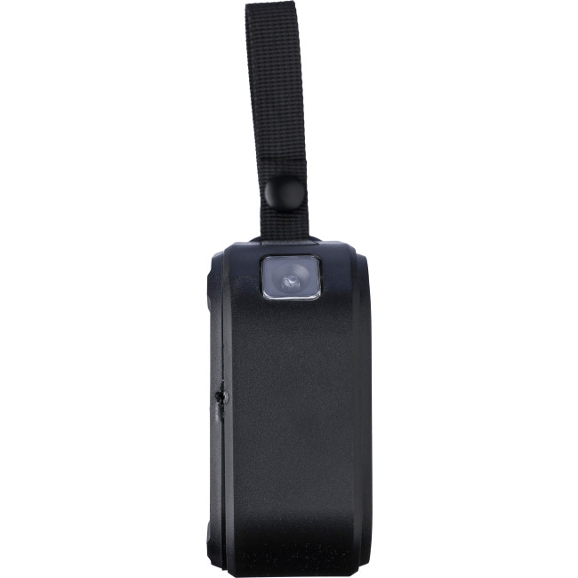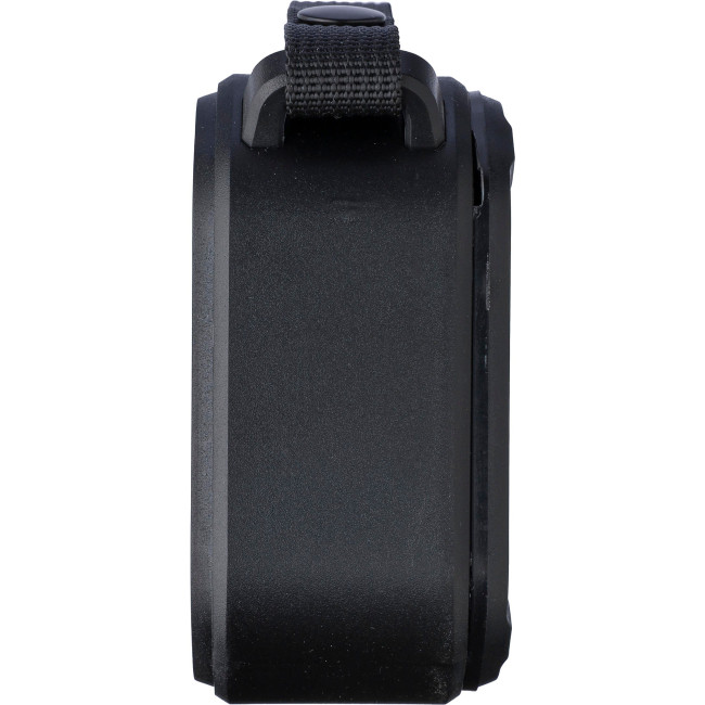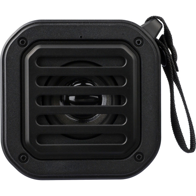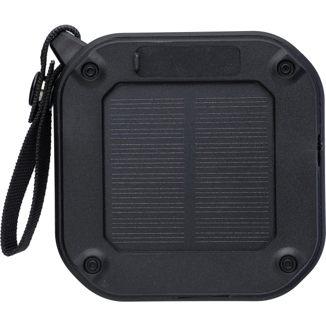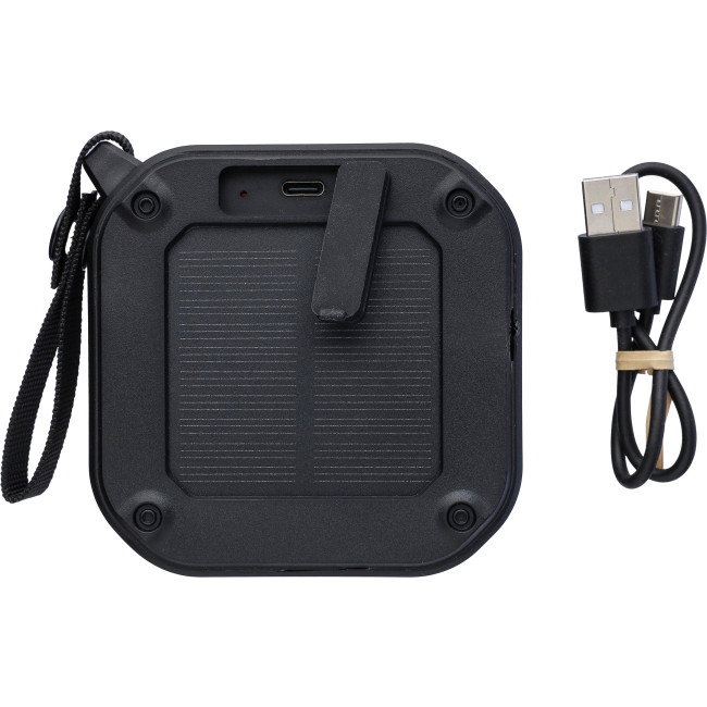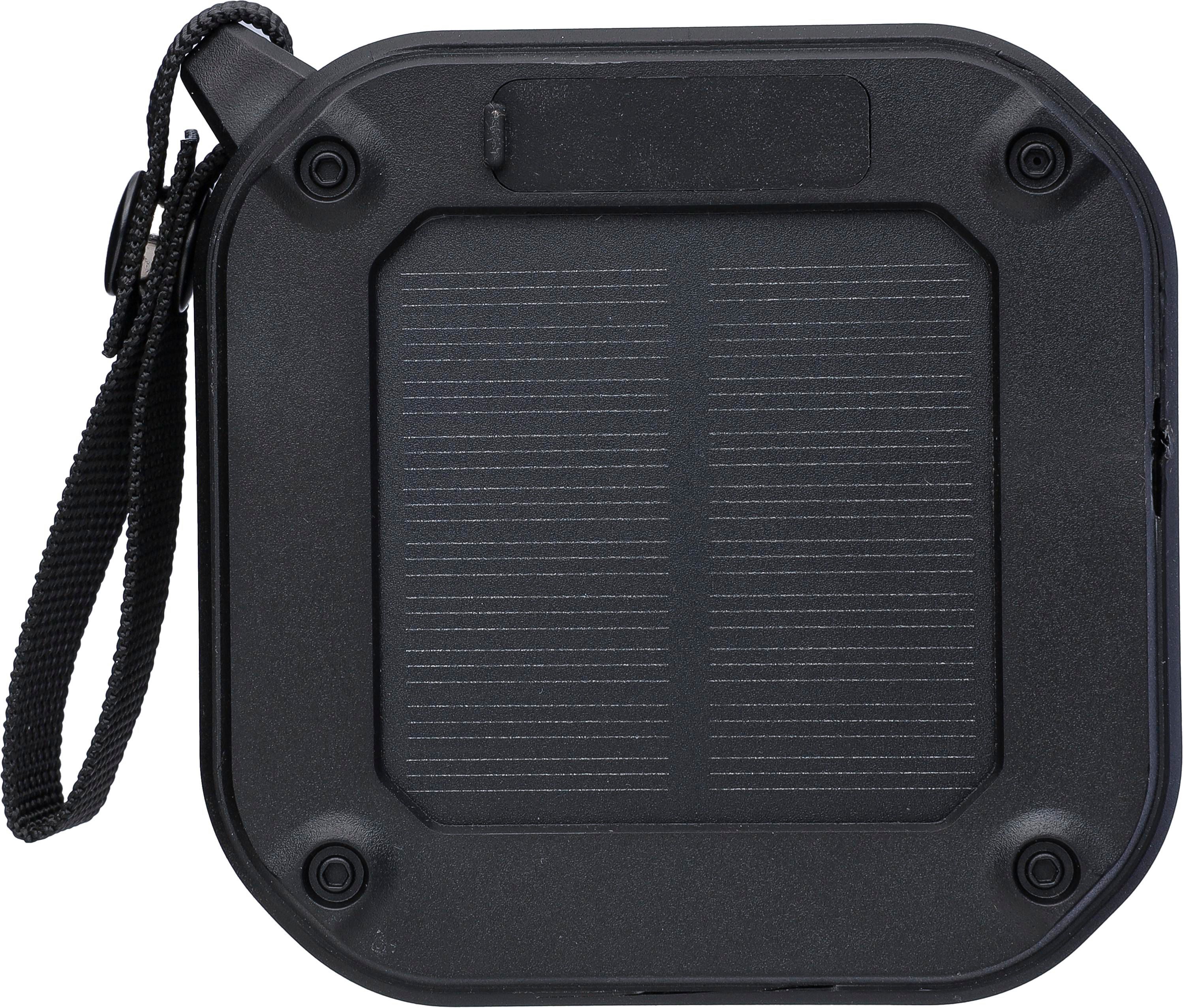 Speaker wireles da esterno in ABS riciclato, include cinturino da polso e moschettone, classificazione IPX6, uscita 3W, ingresso DC 5V, batteria ricaricabile integrata da 400mAh, con 4 ore di autonomia, distanza operativa di circa 15-20 metri, rapporto segnale/rumore di 75 dB, gamma di frequenza: 100 Hz a 20 kHz, include cavo per la ricarica Type-C da 30 cm, torcia LED integrata (30 lucette), pannello solare per prolungare l'utilizzo, tecnologia di connessione wireless: 5.3, confezionato singolarmente in una scatola in cartone avana