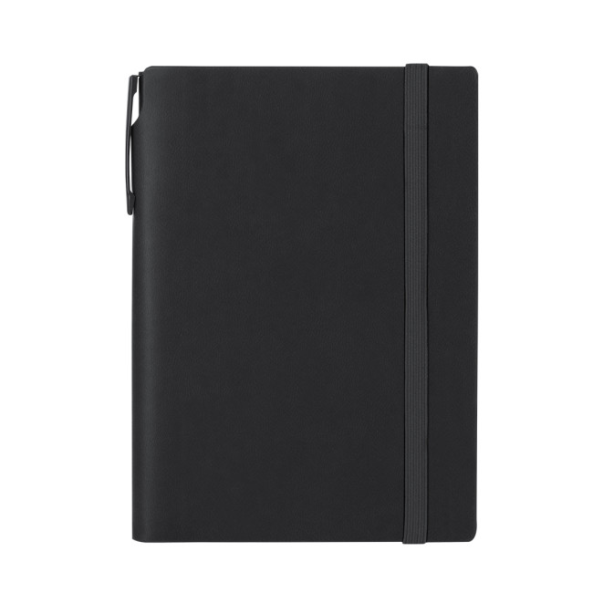 Un blocco note e una penna fatti di PU riciclato e alluminio riciclato. Il set comprende: - Bloccuini per note realizzato in PU riciclata. Copertine rigide, comprende 96 pagine color crema, segnalibro e nastro elastico abbinato per chiusura. Con il logo in PU riciclato. - Penna in alluminio riciclato, con corpo di colore uniforme in finitura in gomma. Ha una pinza, un meccanismo a pulsante e inchiostro blu. Include il badge del logo in alluminio riciclato.Il blocco ha uno spazio per conservare la penna così puoi portare tutto in un unico posto.