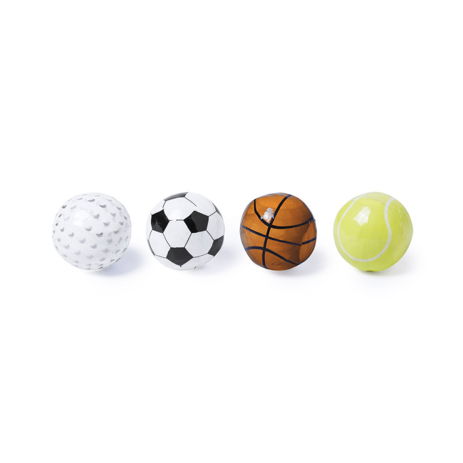 Originale asciugamano in materiale cotone da 245 grammi. Ripiegato all'interno di una palla con disegni di calcio, basket, tennis e golf. Pallone avvolto in un sacchetto e presentato in una borsa in poliestere con moschettone in metallo per il trasporto.