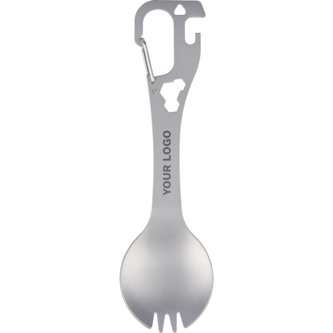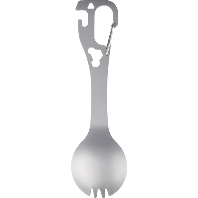 Spork utensile da cucina in acciaio inox con forchetta e cucchiaio integrati, cacciavite piatto, apribottiglie e aprilattine, e tre chiavi esagonali nel corpo, include moschettone, confezionato singolarmente in sacchetto di carta.